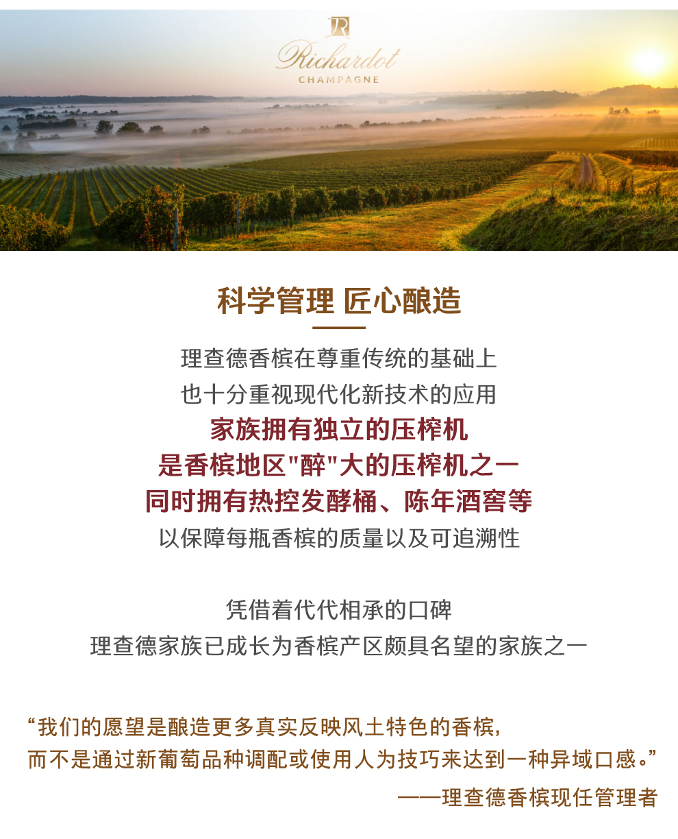 家族拥有独立的压榨机,是香槟地区最大的压榨机之一,同时拥有热控发酵桶、陈年酒窖,来保障每瓶香槟的质量以及可追溯性。理查德家族已成为香槟地区很有名望的酿酒家族。