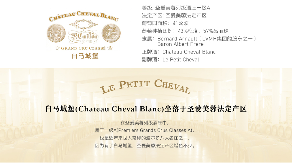 白马庄园(Chateau Cheval Blanc)坐落于圣爱美容法定产区。在圣爱美容列级酒庄中,属于一级特等酒庄A级(Premiers Grands Crus Classes A),也是近年来世人常称的波尔多八大名庄之一。因为有了白马庄园,圣爱美容法定产区增色不少。