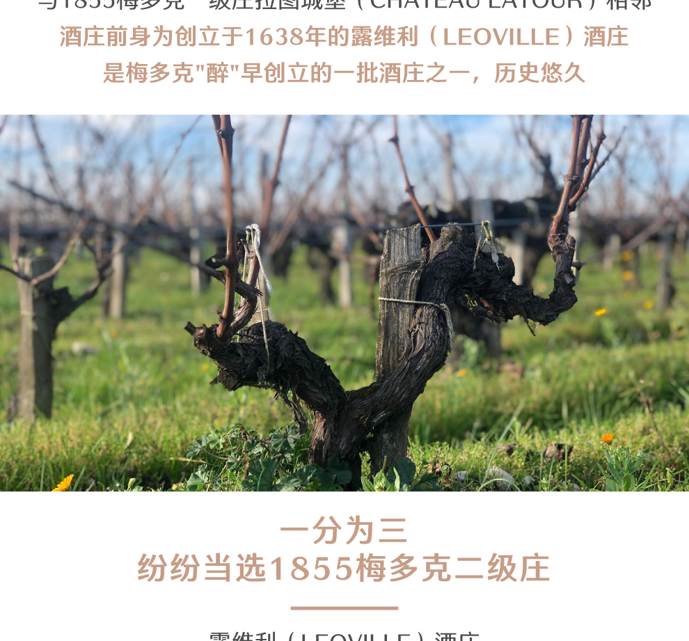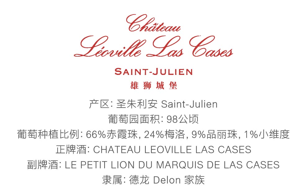 雄狮酒庄(Chateau Leoville Las Cases)位于圣朱利安(Saint Julien)和波雅克(Pauillac)边缘,与一级名庄拉图酒庄(Chateau Latour)相连。在波尔多所有名庄中是最有实力,或说有能力挑战传统5大一级庄的酒庄之一,所以雄狮酒庄被一般行家称为“超二级酒庄”(super2),而罗伯特·帕克(Robert Parker)早就将雄狮酒庄放在他所评定的波尔多一级庄之列,与传统5大名庄齐名。雄狮酒庄名称源于Leoville的英文“Leo”,意为“雄狮”的意思,后改名为Leoville La Cases。要充分了解雄狮酒庄的历史,首先必须了解创建于1638年的利奥维(Leoville)酒庄。贝斯·安东尼·亚历山大·盖斯克(Blaise Antoine Alexandre de Gascq)是露维利酒庄的庄主和波尔多议会会长。1638年的露维利酒庄在梅多克区的早期历史中被认为是仅次于公认的4大一级庄(拉菲古堡、拉图酒庄、玛歌酒庄和侯伯王酒庄)之后的酒庄。