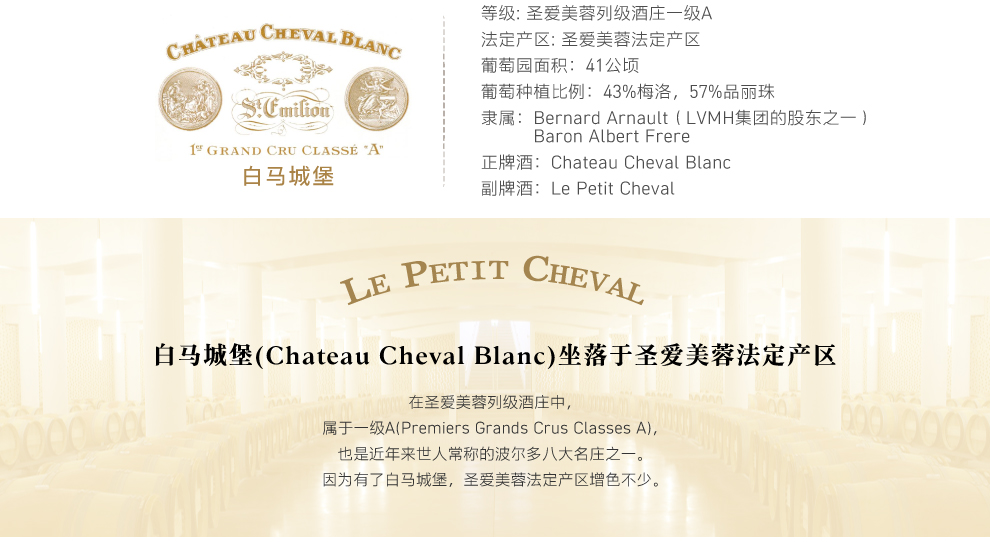 白马庄园(Chateau Cheval Blanc)坐落于圣爱美容法定产区。在圣爱美容列级酒庄中,属于一级特等酒庄A级(Premiers Grands Crus Classes A),也是近年来世人常称的波尔多八大名庄之一。因为有了白马庄园,圣爱美容法定产区增色不少。