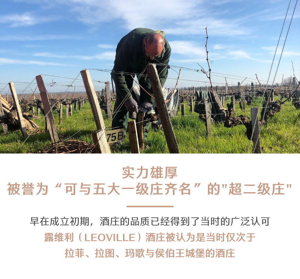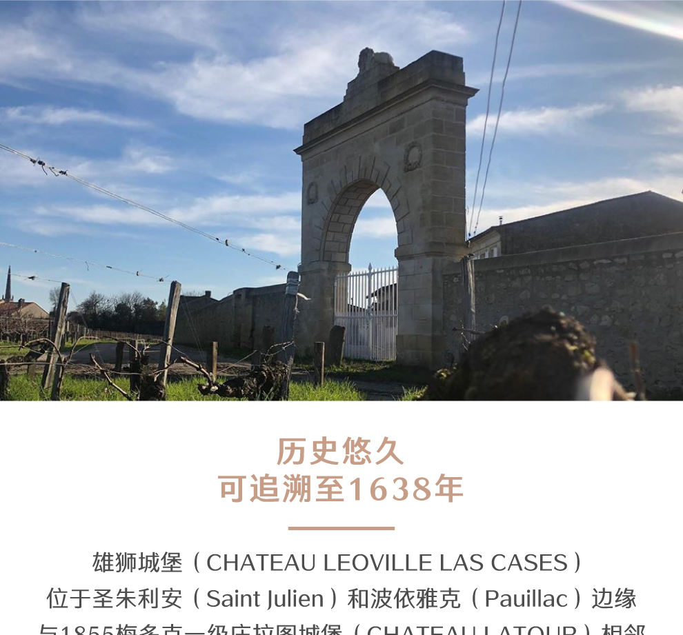 雄狮酒庄(Chateau Leoville Las Cases)位于圣朱利安(Saint Julien)和波雅克(Pauillac)边缘,与一级名庄拉图酒庄(Chateau Latour)相连。在波尔多所有名庄中是最有实力,或说有能力挑战传统5大一级庄的酒庄之一,所以雄狮酒庄被一般行家称为“超二级酒庄”(super2),而罗伯特·帕克(Robert Parker)早就将雄狮酒庄放在他所评定的波尔多一级庄之列,与传统5大名庄齐名。雄狮酒庄名称源于Leoville的英文“Leo”,意为“雄狮”的意思,后改名为Leoville La Cases。要充分了解雄狮酒庄的历史,首先必须了解创建于1638年的利奥维(Leoville)酒庄。贝斯·安东尼·亚历山大·盖斯克(Blaise Antoine Alexandre de Gascq)是露维利酒庄的庄主和波尔多议会会长。1638年的露维利酒庄在梅多克区的早期历史中被认为是仅次于公认的4大一级庄(拉菲古堡、拉图酒庄、玛歌酒庄和侯伯王酒庄)之后的酒庄。