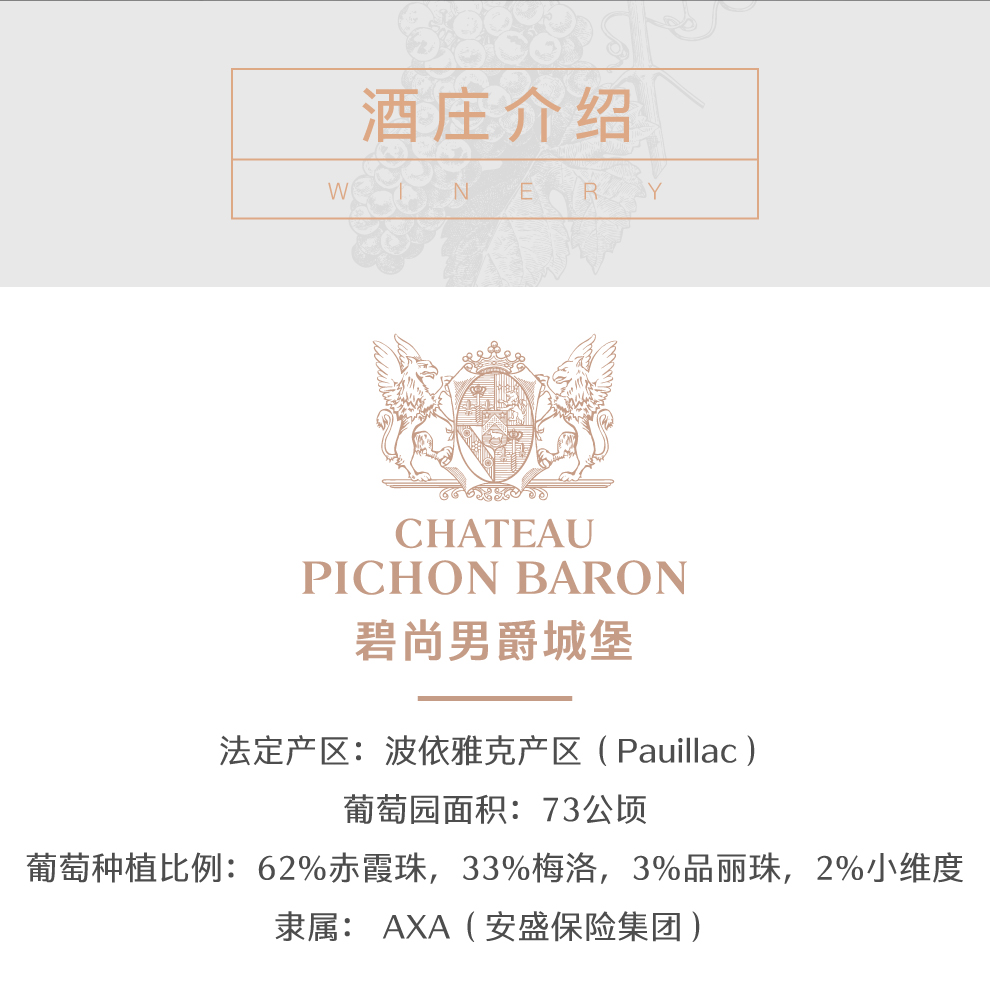 男爵古堡的正牌酒风格优雅而富有力量,能够展现出波雅克的浓郁与复杂,风味十分丰富,单宁成熟且强劲,具有较强的陈年潜力。此外,酒庄还生产两款副牌酒,分别为男爵古堡副牌红葡萄酒(Les Tourelles de Longueville)及男爵古堡狮鹫红葡萄酒(Les Griffons de Pichon Baron)。这两款副牌酒风格活泼,同样也具有迷人的特质,它们一般更适宜早饮。