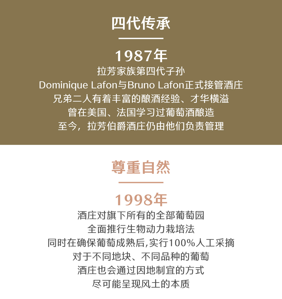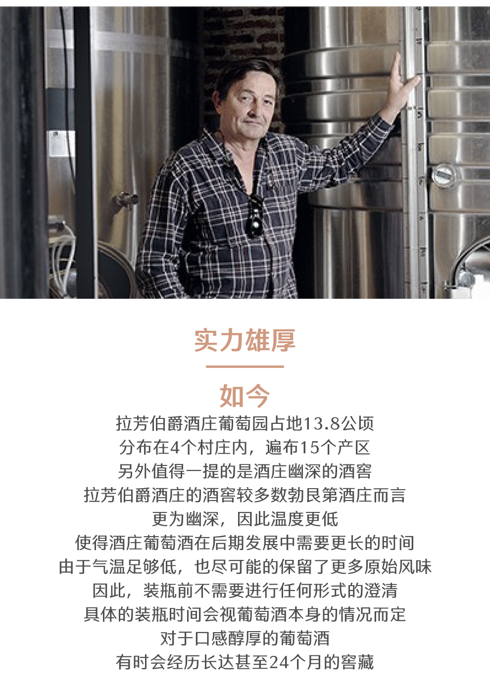 在葡萄酒酿制方面,低产量,成熟的葡萄,完全不进行人工干涉的酿酒过程被视为拉芳伯爵酒庄酿酒准则。用于酿制黑皮诺葡萄酒的葡萄要进行去梗,较之霞多丽葡萄酒(更新比例为20%-35%),它的新橡木桶更换比例也高一些(高达50%)。该酒庄的酒窖是整个勃艮第地区最幽深,温度也是最低的。由于这个原因,拉 芳酒庄葡萄酒的后期需要继续发展的时间总是被拖长,其中最典型的是,葡萄酒需要在背风处存放2年。由于酒窖内气温足够低,葡萄酒几乎会保持自然的原始状态, 因此装瓶前不需要进行任何形式的澄清。酒庄的具体装瓶时间十分灵活,主要视每一年的具体情况而定:那些口感特别醇厚的葡萄酒在装瓶前要进行长达24个月的 窖藏,而那些口感清淡的年份酒则需要提早装瓶。