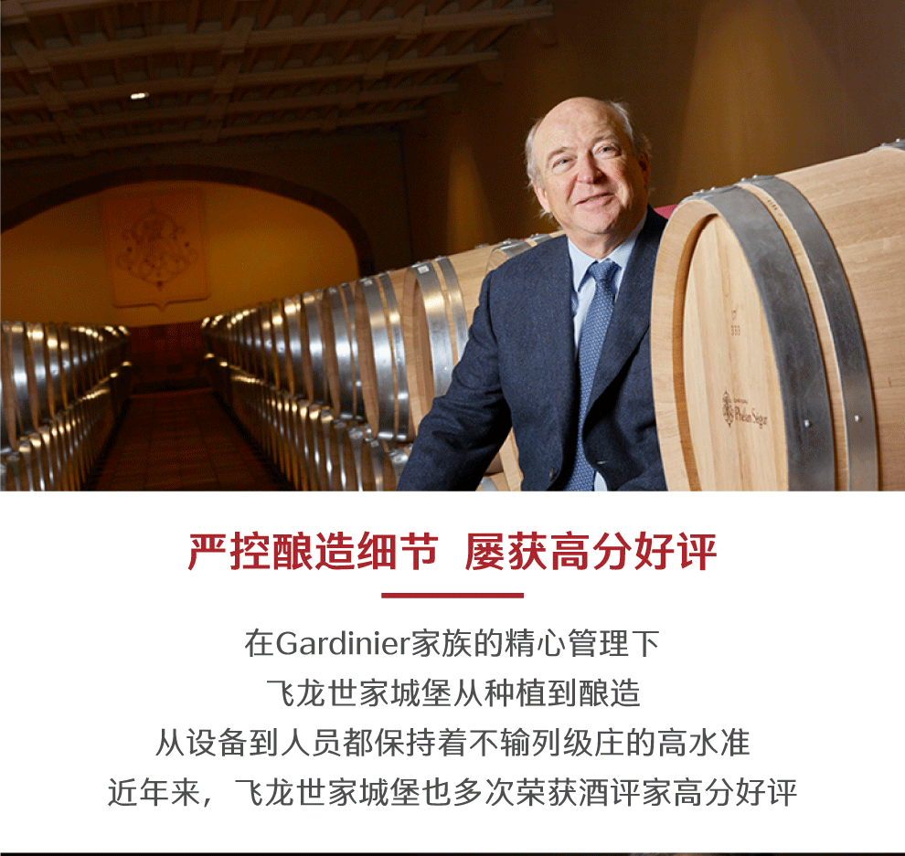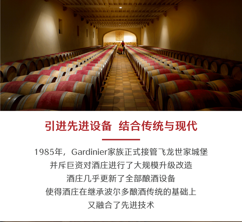 飞龙世家酒庄,堪称潜力无限,不仅在国际上声名显赫,而且深得酒评届的多次肯定。能得到这样的殊荣,与飞龙世家对其佳酿的严格把关和致力于葡萄酒行与所作出的贡献密不可分。自从1985年Gardinier家族接受该酒庄后,不仅花重金进行了大规模的投资,更新了几乎全部设备,使其达到了世界最先进的标准;而且以十分认真严谨的态度来管理酒庄,保证了飞龙世家产品的高水准。通过Gardinier父子这近二十年的努力,酒庄无论从设备到葡萄的种植管理都始终在最一流的水平。