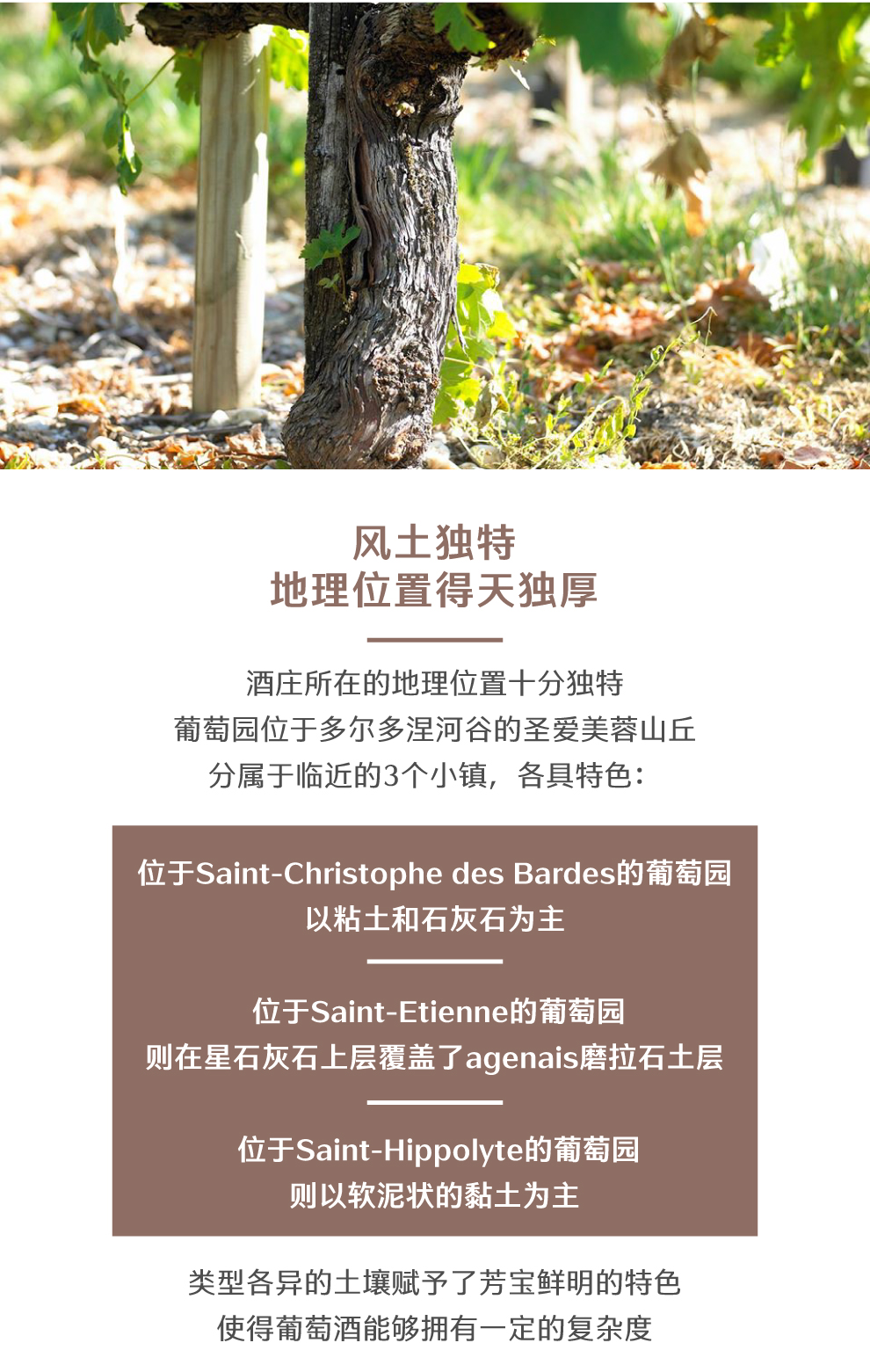 芳宝庄园拥有非常有利的地理条件,葡萄园位于多尔多涅河谷的圣爱美容山丘上,分属于临近的3个小镇:圣克里斯多夫(Saint-Christophe des Bardes)、圣埃蒂安(Saint-Etienne)和圣伊颇力特(Saint-Hippolyte)。圣克里斯多夫葡萄园的土质主要由粘土和石灰石组成,位于圣克里斯多夫东南的圣埃蒂安的地质也非常特别,海星石灰石上层覆盖了阿热奈(agenais)磨拉石土层,圣伊颇力特则以软泥状的黏土为主。