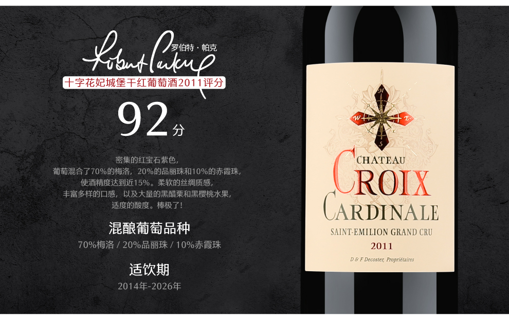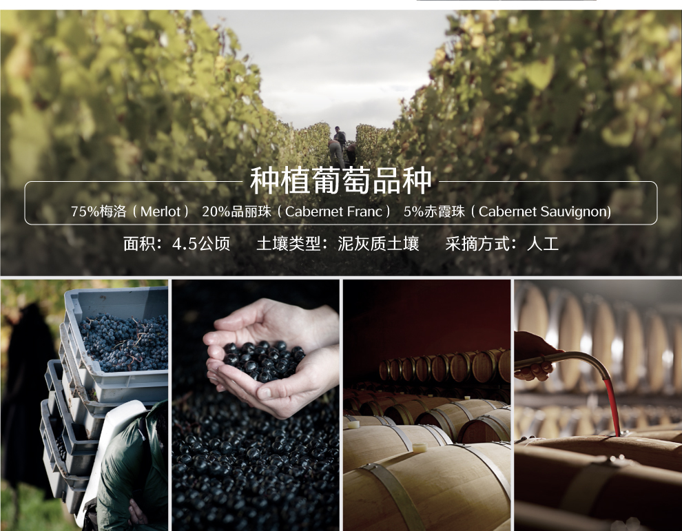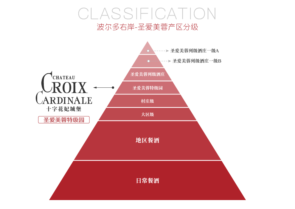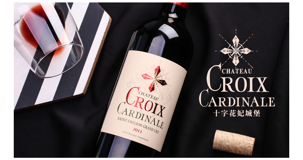 十字花妃城堡(Château Croix Cardinale 所用的葡萄产自40年历史的葡萄树, 种植在一片连绵的葡萄园里。 70%的葡萄品种为梅洛, 25%为品丽珠。 这种圣爱美蓉的佳酿是在完全通过生态工艺经改革过的酒库里酿制生产。