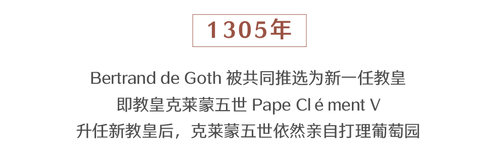 1305至1309年,教皇继续管理自己的葡萄园,这也由此成为他的一项专长。但受教廷繁多的事务所迫,教皇无法继续精心操持葡萄园,所以1309年12月12日,他决定将这块产地赠予当时的波尔多大主教阿尔诺·德·康特鲁(Arnaud de Canteloup)。将葡园托付给波尔多教会管理,这无疑是克莱蒙五世所想到的能让葡园永世传承的最好方法,正因如此,克莱蒙教皇的葡萄园得以在接下来的几个世纪内保持最初的风貌。