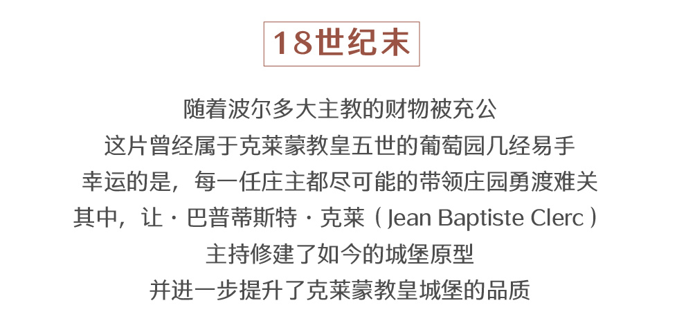 这里不得不提到让·巴普蒂斯特·克莱(Jean Baptiste Clerc)这名波尔多葡萄酒批发商,他于1858年购置这一产地,并将其打造成一个模范葡园。在他的管理下,有着细腻口感的克莱蒙教皇葡萄酒在1878年的世博会中分别摘得纪隆德农业协会金奖和农业部特级金奖,这两项荣誉很好地稳固了葡萄酒的知名度。