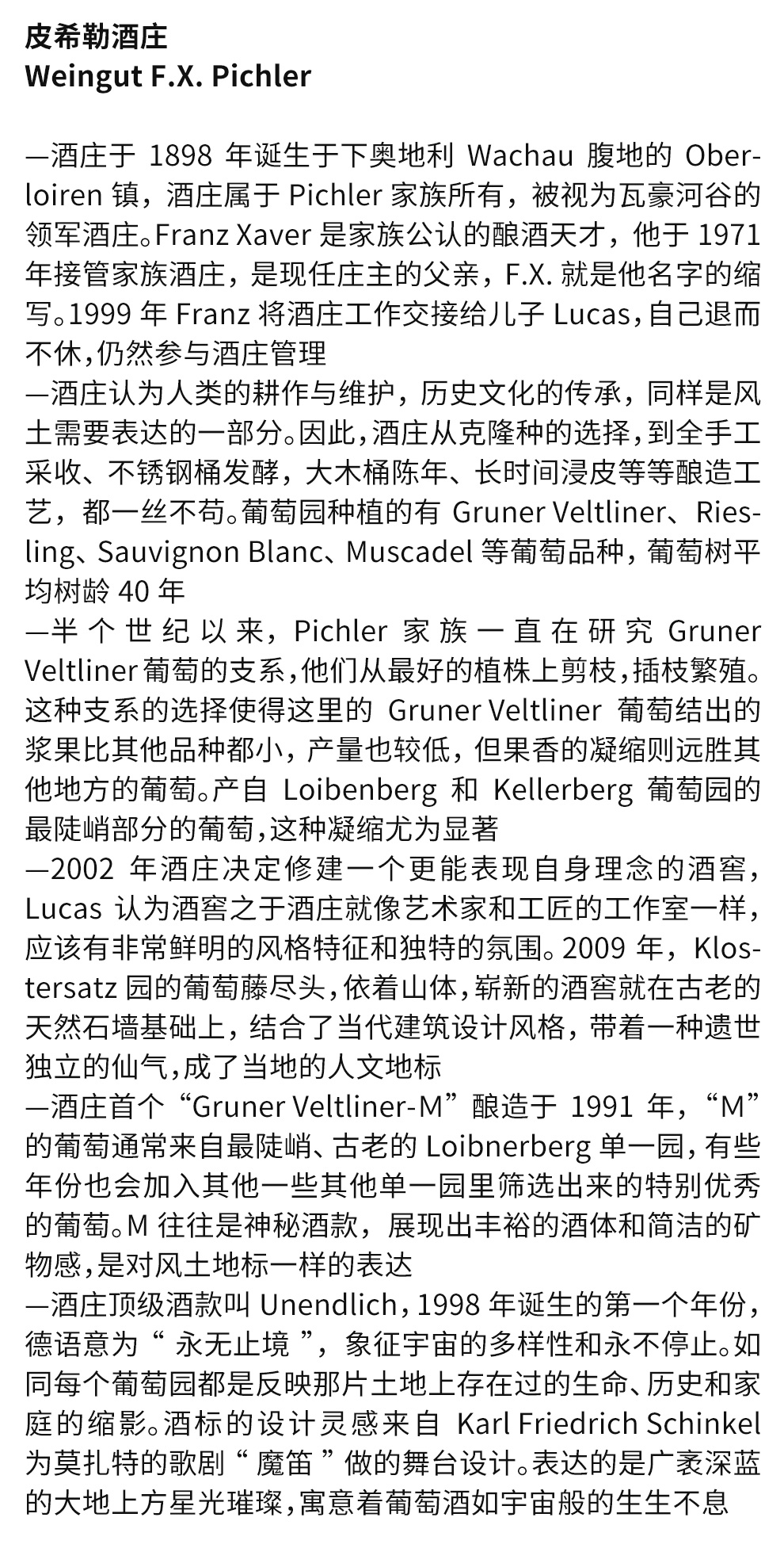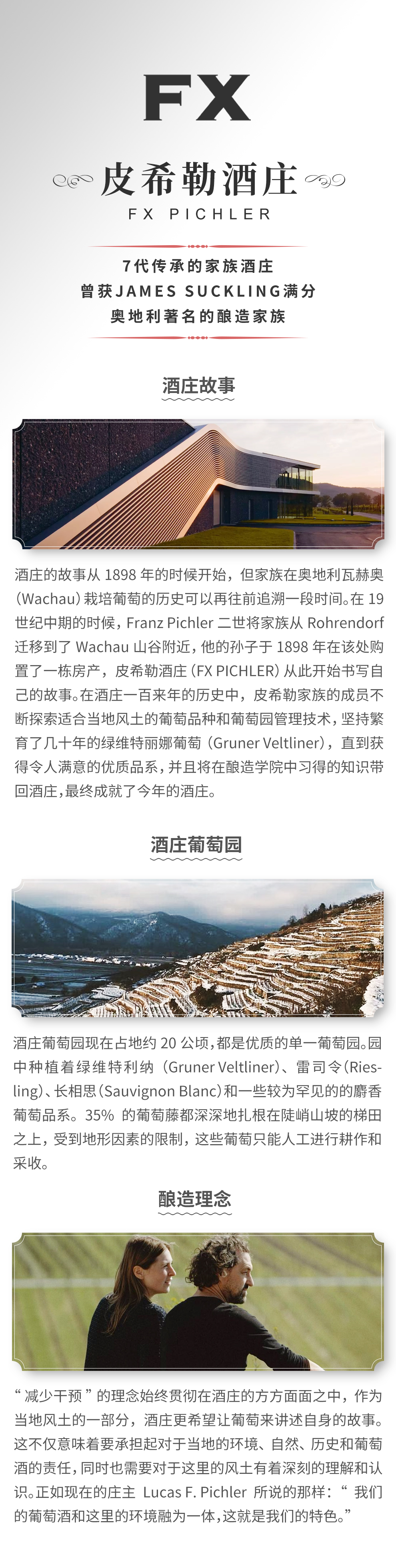 酒庄的故事从1898年的时候开始,但家族在奥地利瓦赫奥(Wachau)栽培葡萄的历史可以再往前追溯一段时间。在19世纪中期的时候,Franz Pichler二世将家族从Rohrendorf迁移到了Wachau山谷附近,他的孙子于1898年在该处购置了一栋房产,皮希勒酒庄(FX PICHLER)从此开始书写自己的故事。在酒庄一百来年的历史中,皮希勒家族的成员不断探索适合当地风土的葡萄品种和葡萄园管理技术,坚持繁育了几十年的绿维特丽娜葡萄(Gruner Veltliner),直到获得令人满意的优质品系,并且将在酿造学院中习得的知识带回酒庄,最终成就了今年的酒庄。