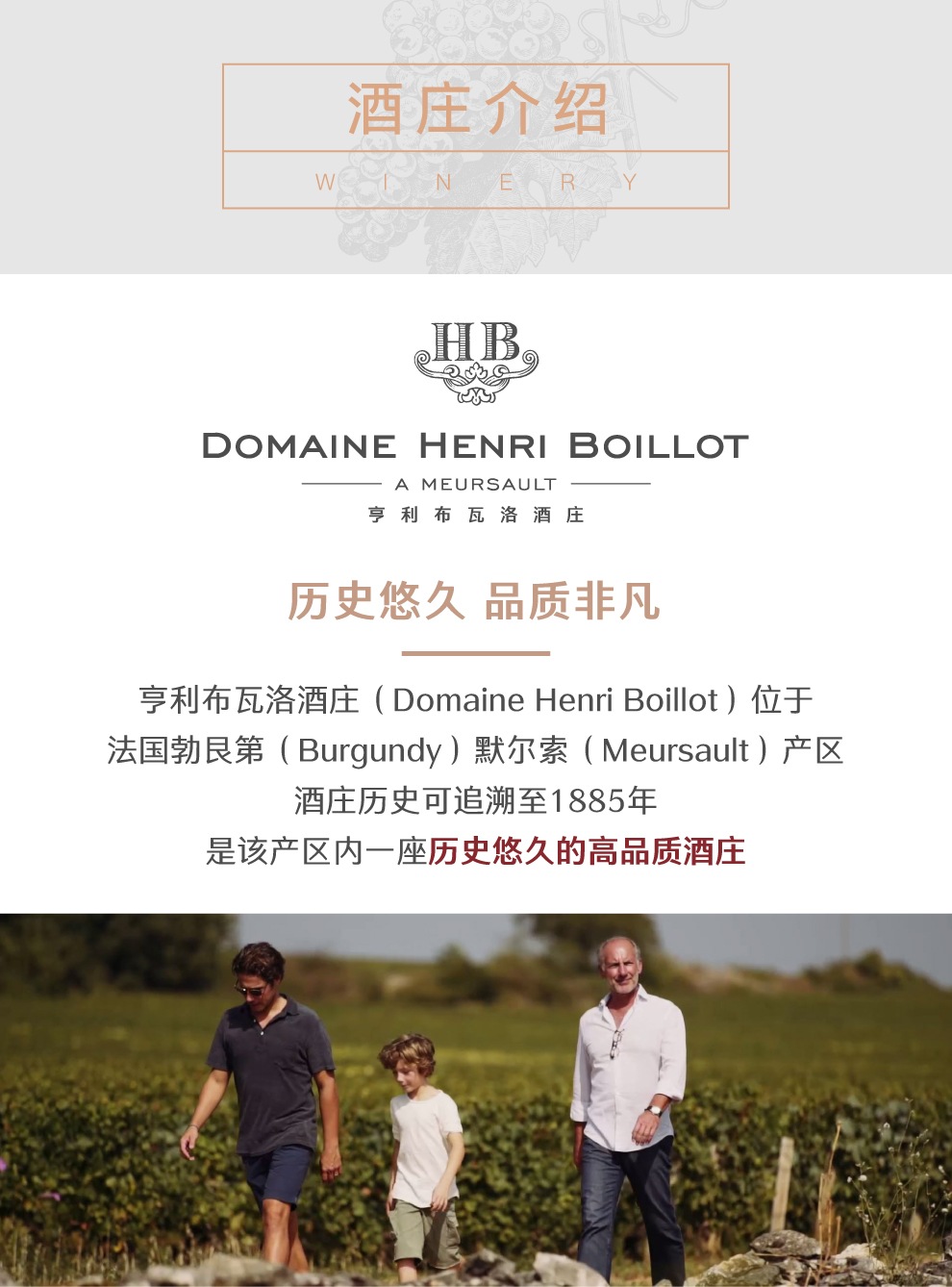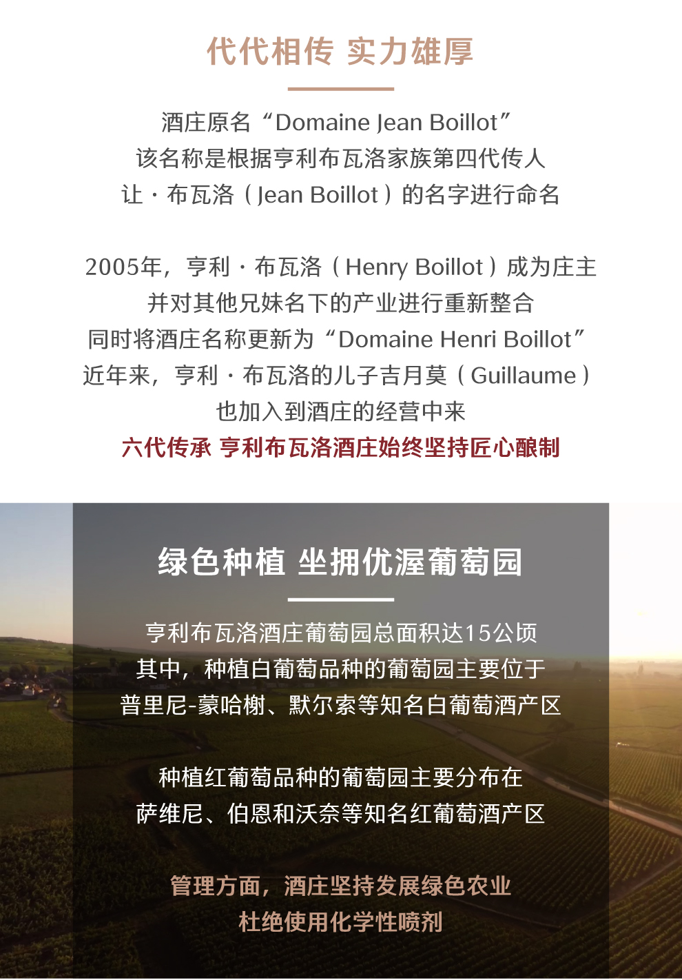 亨利布瓦洛酒庄的历史最早可以追溯到1885年。从那时起,亨利布瓦洛家族就已经开始种植葡萄树并酿酒了。布瓦洛酒庄原名是“Domaine Jean Boillot”,根据亨利布瓦洛家族第四代传人让·布瓦洛(Jean Boillot)的名字命名。2005年,让·布瓦洛的儿子亨利·布瓦洛(Henry Boillot)将其他兄妹名下的产业股权买了下来,并将这些产业重新整合为一个酒庄,最后改名为“Domaine Henri Boillot”。酒庄目前的庄主亨利·布瓦洛是布瓦洛家族的第五代传人。近几年,他的儿子吉月莫(Guillaume)也加入到酒庄的经营中来。