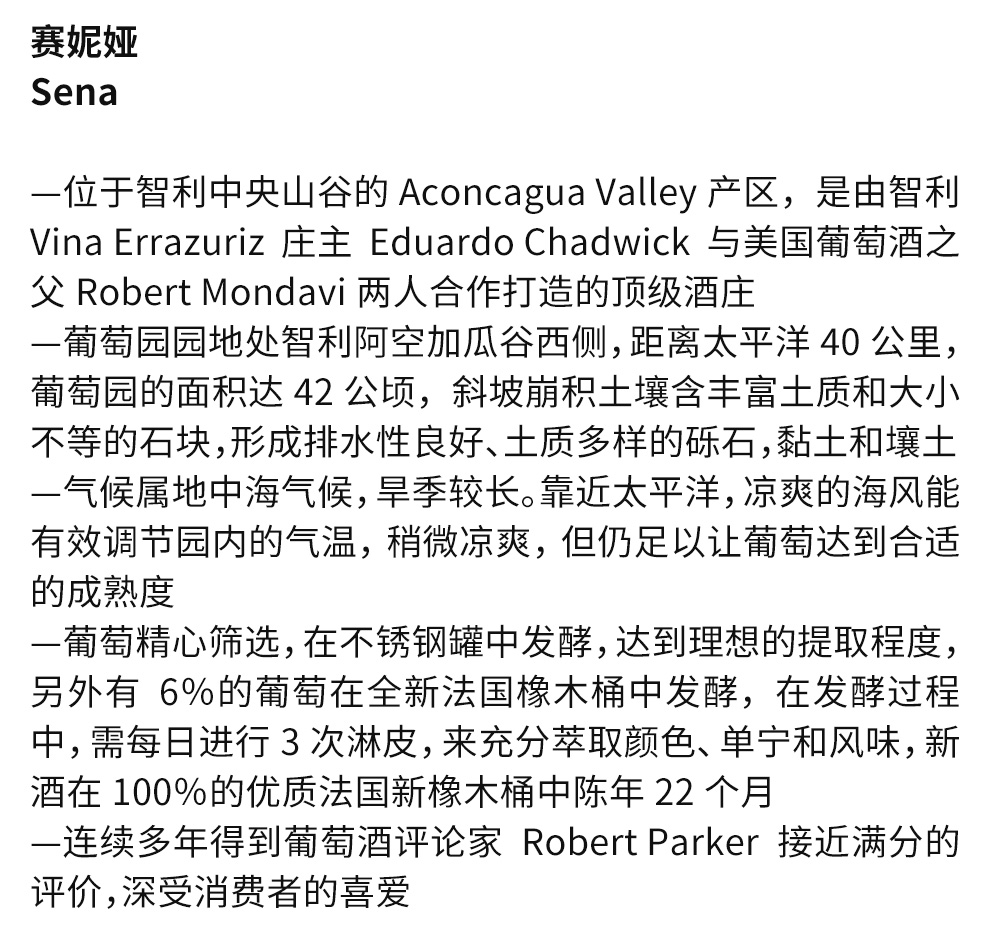 (Sena)位于智利的阿空加瓜谷(Aconcagua Valley)产区,是由智利伊拉苏酒庄(Vina Errazuriz)的庄主爱德华多·查威克(Eduardo Chadwick)与美国葡萄酒之父罗伯特·蒙大维(Robert Mondavi)两人合作打造的顶级酒庄。