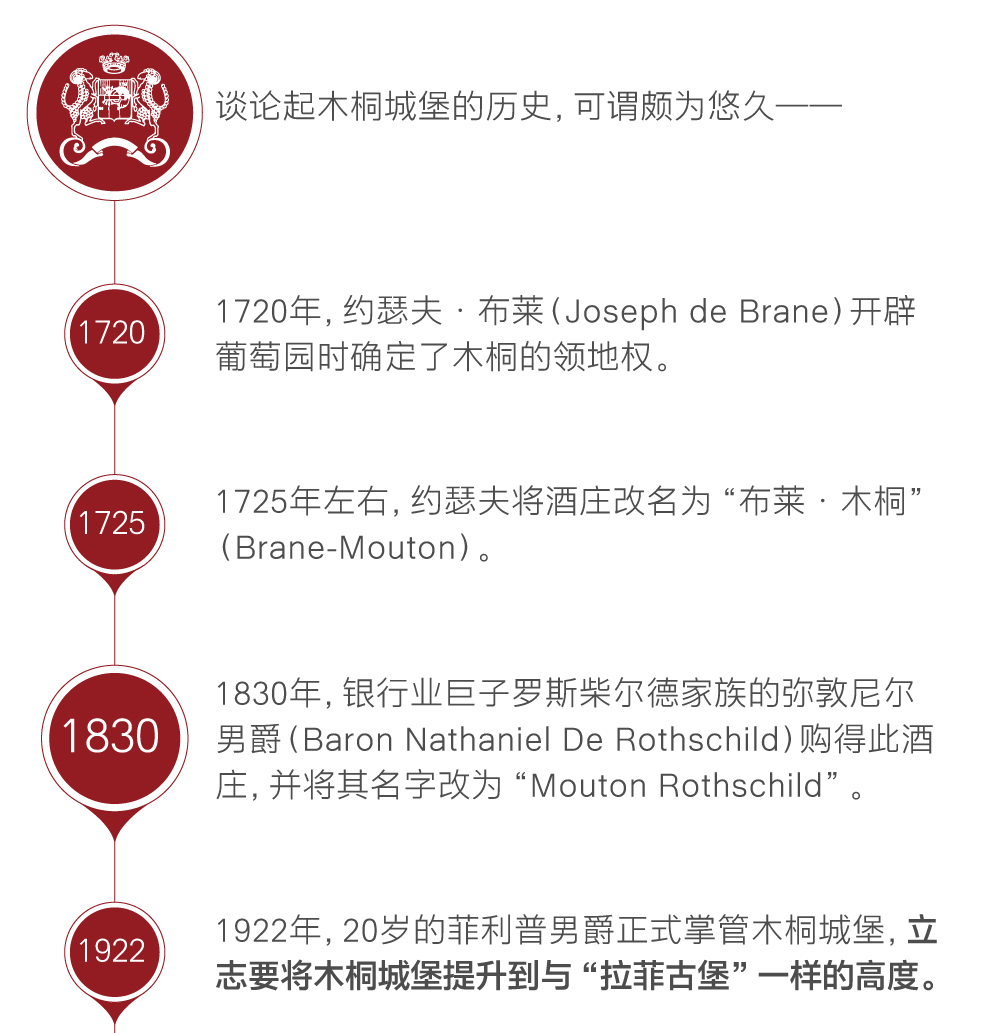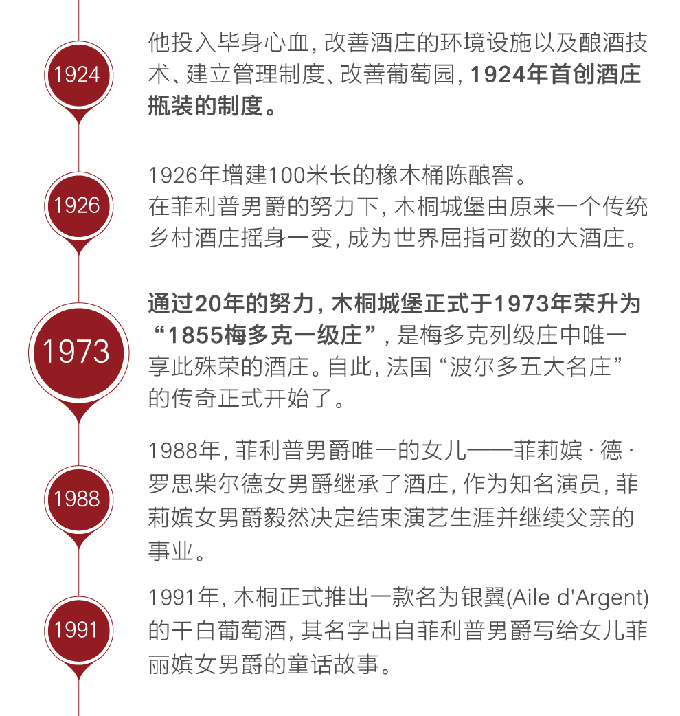 1922年10月22日,菲利普男爵正式入主“木桐酒庄”,当时才20岁的男爵立志要将“木桐酒庄”的酒质提升到与邻近“拉图酒庄”和有亲缘关系的“拉菲古堡”一样的水平。在著名的1855年波尔多分级中,“木桐酒庄”只被列为第二级酒庄,因此菲利普男爵下定决心谋求突破。他全情投入,改善酒庄的环境设施以及酿酒技术,建立管理制度,改善葡萄园,1924年首创酒庄瓶装线的制度,1926年增建100米长的橡木桶陈酿窖,将木桐酒庄从他入主时的一个农村酒庄变为世界先进的顶级酒庄。由于木桐酒庄出产的酒保持着高质量,所以酒的价格一直在最高之列,有时还超过四大顶级酒庄。菲利普提出要将木桐酒庄升级,并为此努力了20年。1973年,木桐酒庄正式升级为一级酒庄。从此,木桐酒庄成为法国波尔多五大顶级酒庄之一。