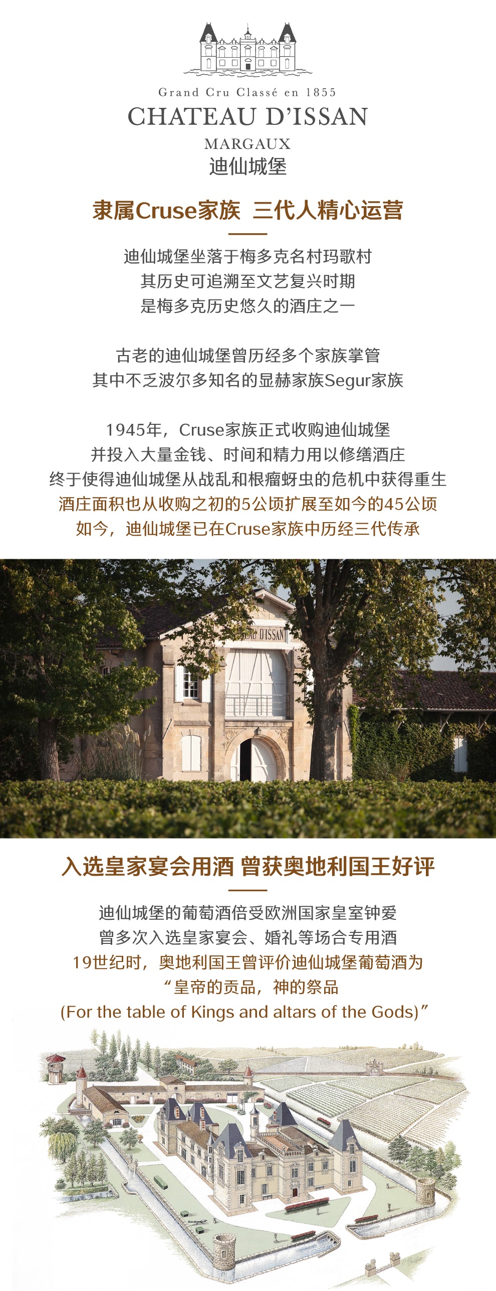 1945年二战后,Cruse家族买下了酒庄。投入金钱、时间和精力修饰酒庄城堡、花园、葡萄园以及各种设备,恢复了迪仙庄昔日的光芒。葡萄园也从刚接手的5公顷扩张到了如今的45公顷。现在Cruse家族对迪仙庄的管理已进入了第三代了。