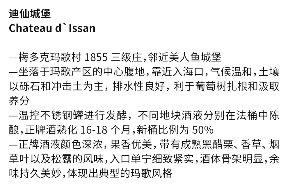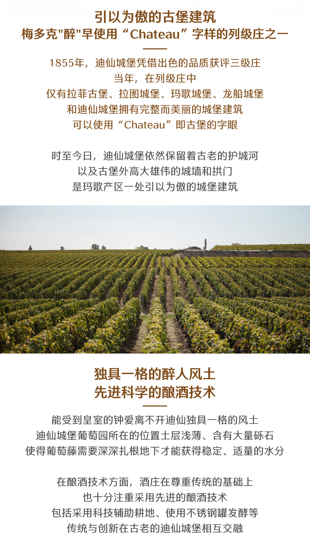 能受到皇室的钟爱,绝佳的风土正是其根源之一。这里的土层是梅多克最浅最薄,且砾石最多的地区。葡萄藤的根部必须深入土壤达到7米,才能获得稳定和适量的水份。在上好的年份里,迪仙酒庄作为典型的玛歌葡萄酒,拥有其他酒庄没有的细腻、甜美,以及醉人的酒香,将砾石土质所有的优点显露无遗。在波尔多酒庄中可谓独一无二。
