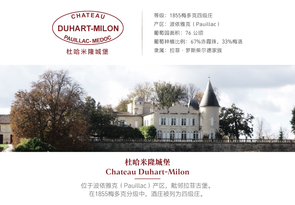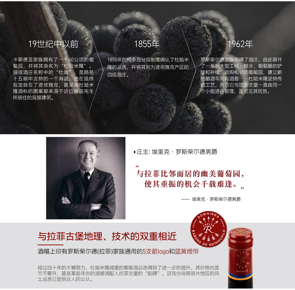 连续不断的继承给古堡带来了不测风云,最终于1937年出售。在之后二十五年的时间里,酒庄先后迎来五位庄主,这也致使葡萄园分裂,从而导致衰败。直至1962年罗斯柴尔德家族购得了酒庄才又拨开云雾。当时,杜哈米隆的庄园面积为110公顷,却仅有17公顷种植葡萄树。自此,一系列大型工程在葡萄园里开展起来:排水工程、葡萄藤的铲除和补植、收购相邻地块的葡萄田,以及通过地块互换来使葡萄园化零为整。另外,还在波亚克产区内建立起了新的酿酒车间和酒窖。从1973至2001年,葡萄园面积从42公顷扩大至71公顷。