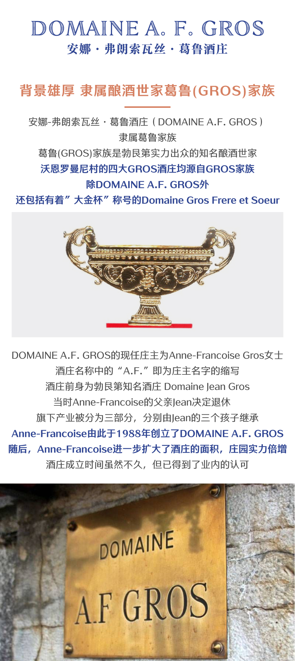 安娜芳华葛鲁酒庄(Domaine A. F. Gros)位于法国勃艮第(Burgundy)伯恩丘(Cote de Beaune)产区,是该产区内一座精品酒庄。AF酒庄的前身是让·葛鲁(Jean Gros)和珍妮·葛鲁(Jeanine Gros)夫妇共同创建的葛鲁-雷诺多(Gros-Renaudot)酒庄。