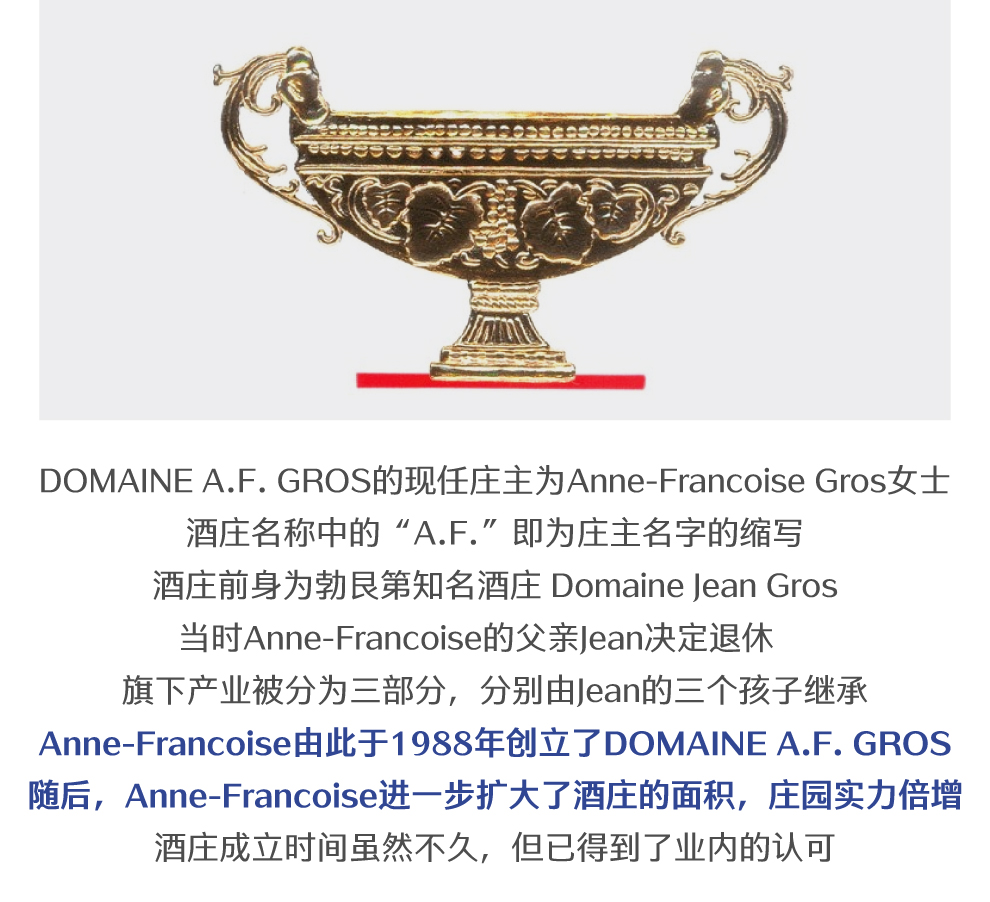 安娜芳华葛鲁酒庄(Domaine A. F. Gros)位于法国勃艮第(Burgundy)伯恩丘(Cote de Beaune)产区,是该产区内一座精品酒庄。AF酒庄的前身是让·葛鲁(Jean Gros)和珍妮·葛鲁(Jeanine Gros)夫妇共同创建的葛鲁-雷诺多(Gros-Renaudot)酒庄。