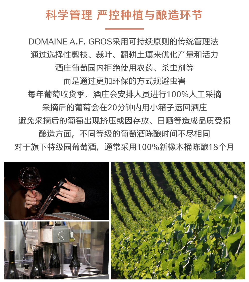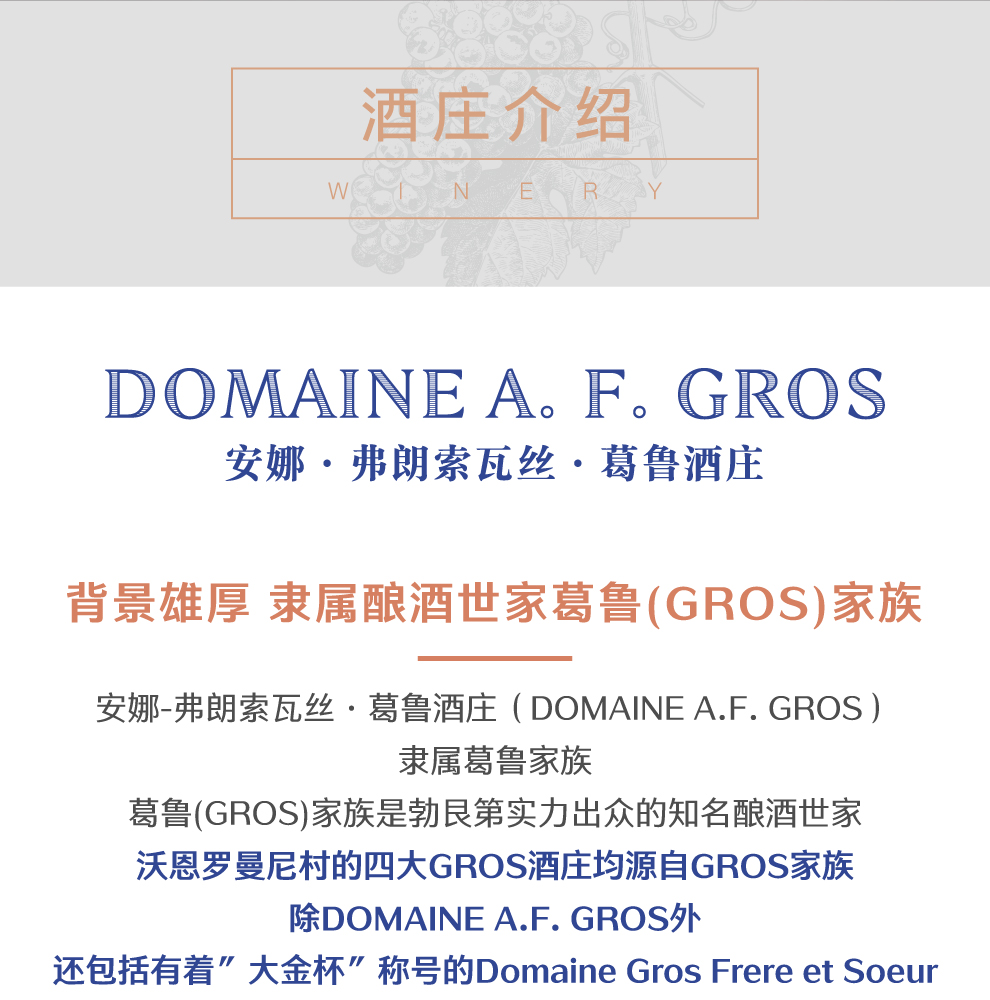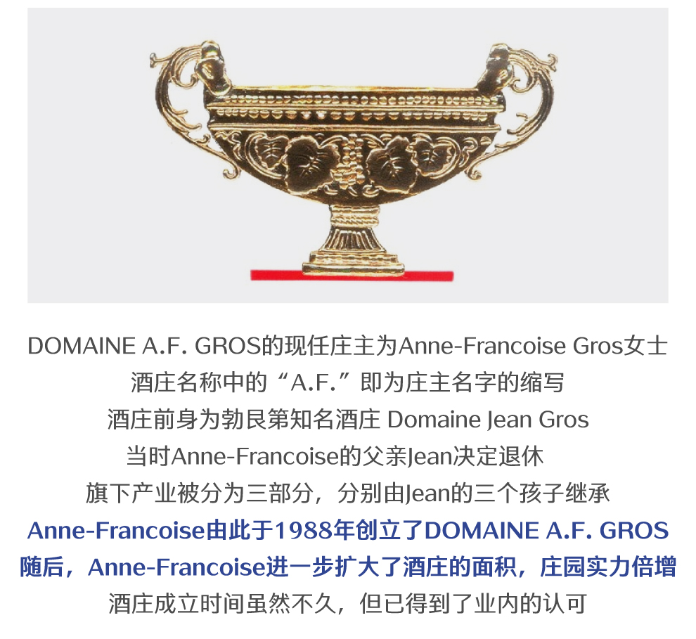 安娜芳华葛鲁酒庄(Domaine A. F. Gros)位于法国勃艮第(Burgundy)伯恩丘(Cote de Beaune)产区,是该产区内一座精品酒庄。AF酒庄的前身是让·葛鲁(Jean Gros)和珍妮·葛鲁(Jeanine Gros)夫妇共同创建的葛鲁-雷诺多(Gros-Renaudot)酒庄。
