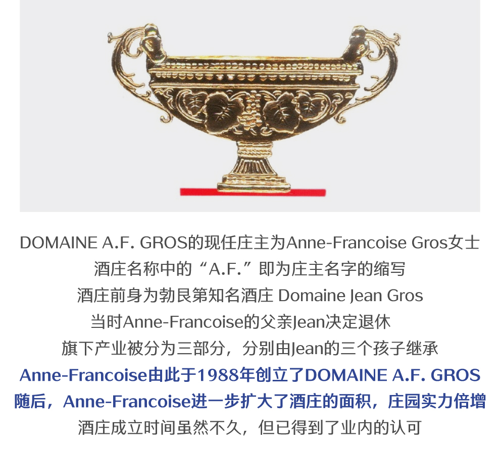 安娜芳华葛鲁酒庄(Domaine A. F. Gros)位于法国勃艮第(Burgundy)伯恩丘(Cote de Beaune)产区,是该产区内一座精品酒庄。AF酒庄的前身是让·葛鲁(Jean Gros)和珍妮·葛鲁(Jeanine Gros)夫妇共同创建的葛鲁-雷诺多(Gros-Renaudot)酒庄。