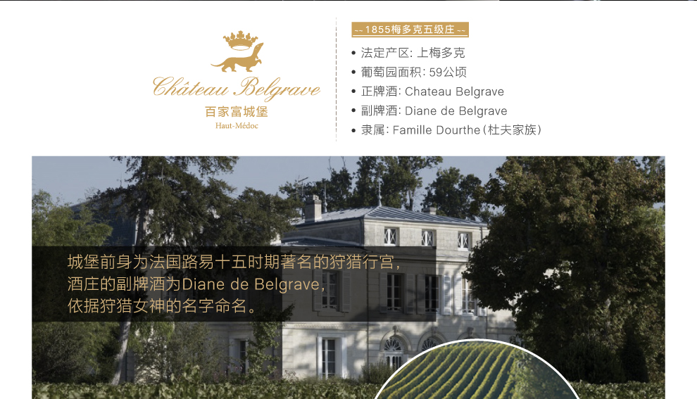 城堡前身为法国路易十五时期著名的狩猎行宫,酒庄的副牌酒为Diane de Belgrave,依据狩猎女神的名字命名。