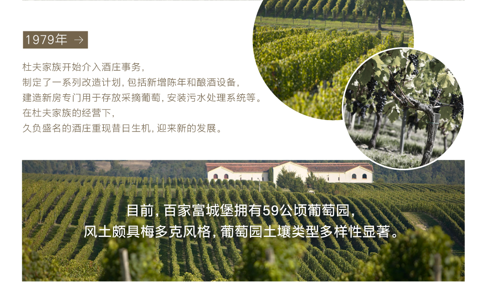 1979年,杜夫家族开始介入酒庄事务,制定了一系列改造计划,包括新增陈年和酿酒设备,建造新房专门用于存放采摘葡萄,安装污水处理系统等。在杜夫家族的经营下,久负盛名的酒庄重现昔日生机,迎来新的发展。