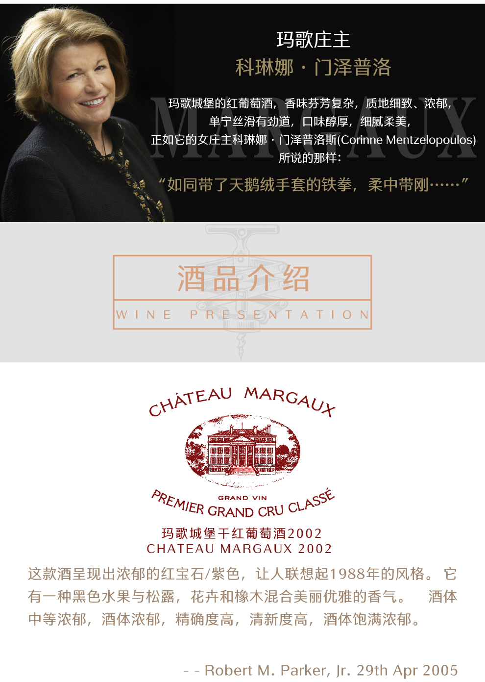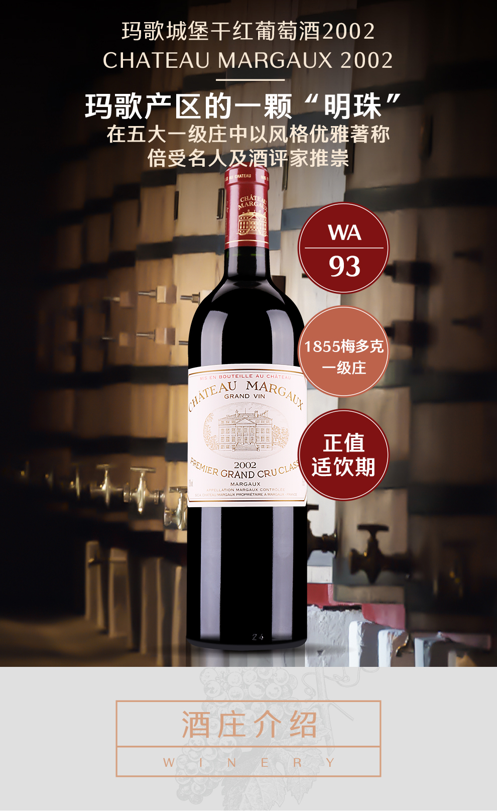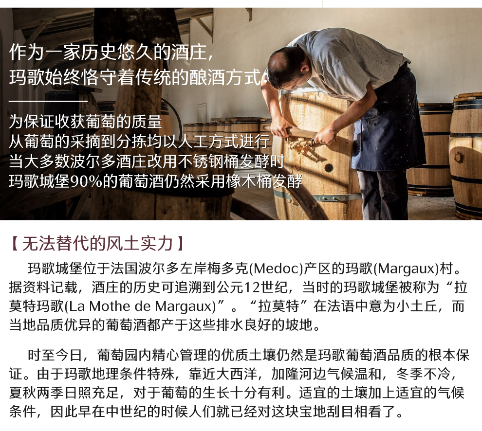 在波尔多的五大顶级酒庄中,玛歌堡的独特之处如同其城堡一样,是一种优雅迷人与气势磅礴的完美结合,其出产的产品均品质兼优,只要一上市常常被抢购一空。
