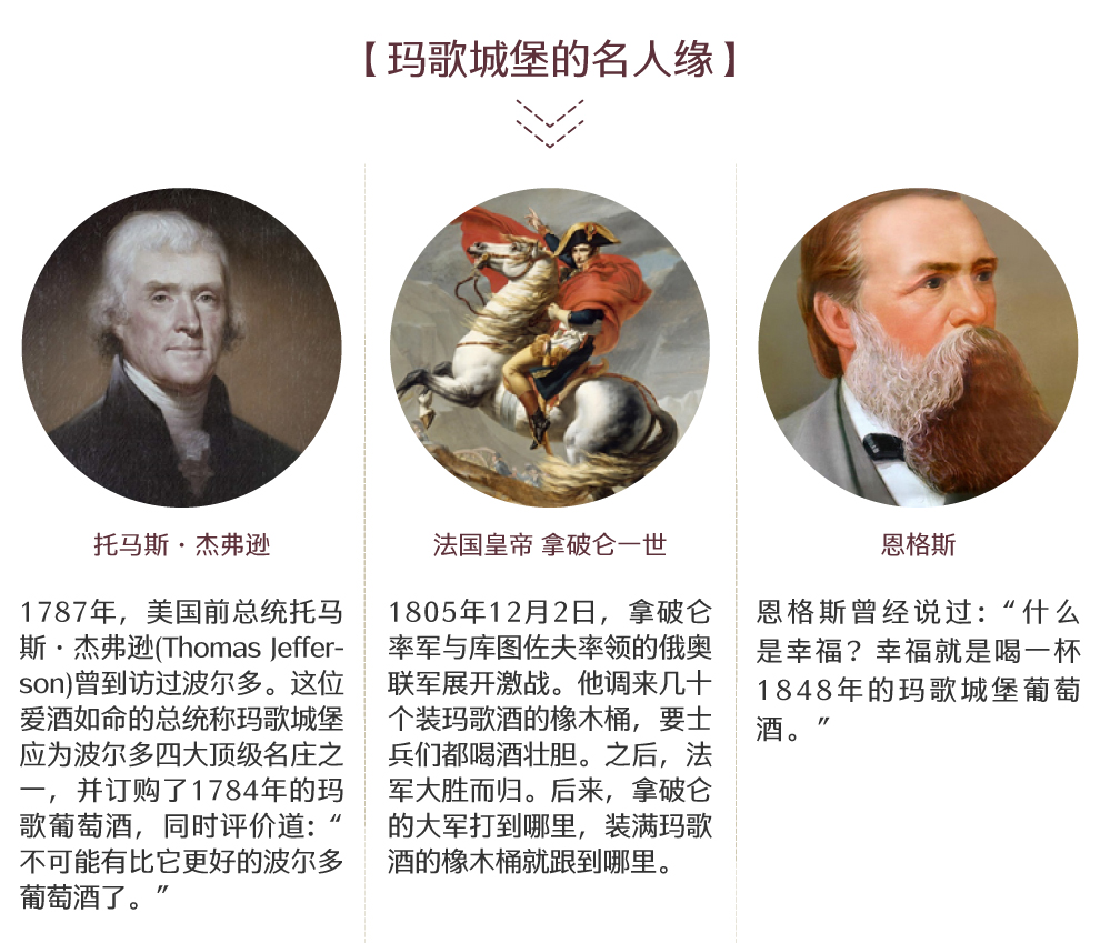 1787年,对法国葡萄酒痴迷有加的美国前总统托马斯·杰弗逊就曾将玛歌酒庄评为波尔多名庄之首。不过,玛歌闻名于世,却是因为拿破仑。1805年12月2日, 拿破仑率军与库图佐夫率领的俄奥联军展开激战。他调来几十个装玛歌酒的橡木桶,要士兵们都喝酒壮胆。最后,法军大胜而归。后来,拿破仑的大军打到哪里,装 满玛歌酒的橡木桶就跟到哪里。玛歌的酒已经成了拿破仑心中的护身符,以至于后来滑铁卢战败,拿破仑也把它归结为士兵没酒喝,所以没了斗志。后来,拿破仑在 被流放的圣赫勒拿岛上,竟恳求看守他的英军士兵,去为他拿些玛歌堡的酒来。而在拿破仑的《圣赫勒拿回忆录》里,他再次提到玛歌堡的酒对他打仗的重要性。他 在书中写道:“因大雪封山,使得100桶玛歌堡酒未能运到滑铁卢前线。”由此可见他对战败的耿耿于怀和对玛歌堡的情有独钟。