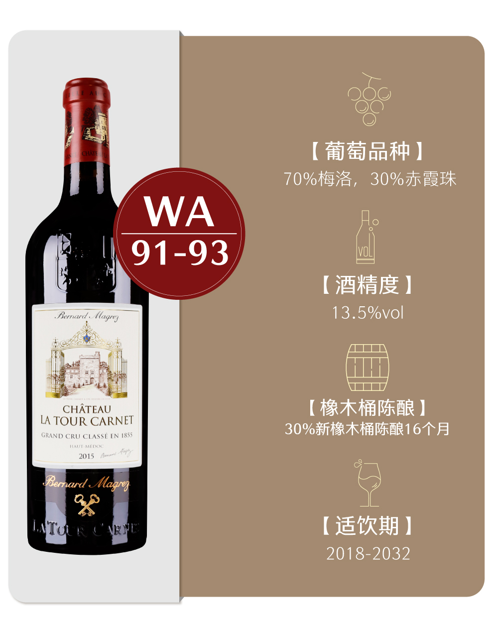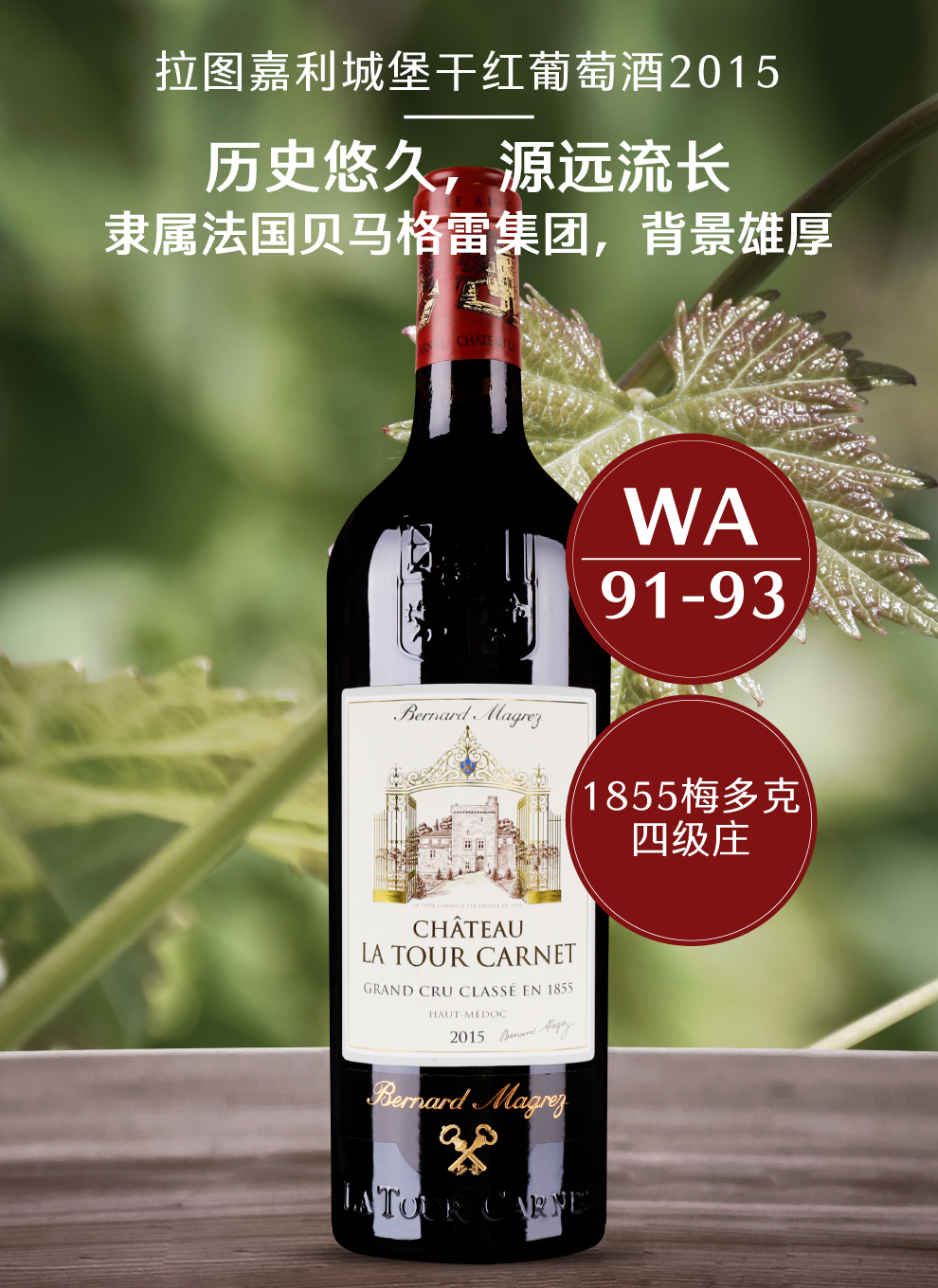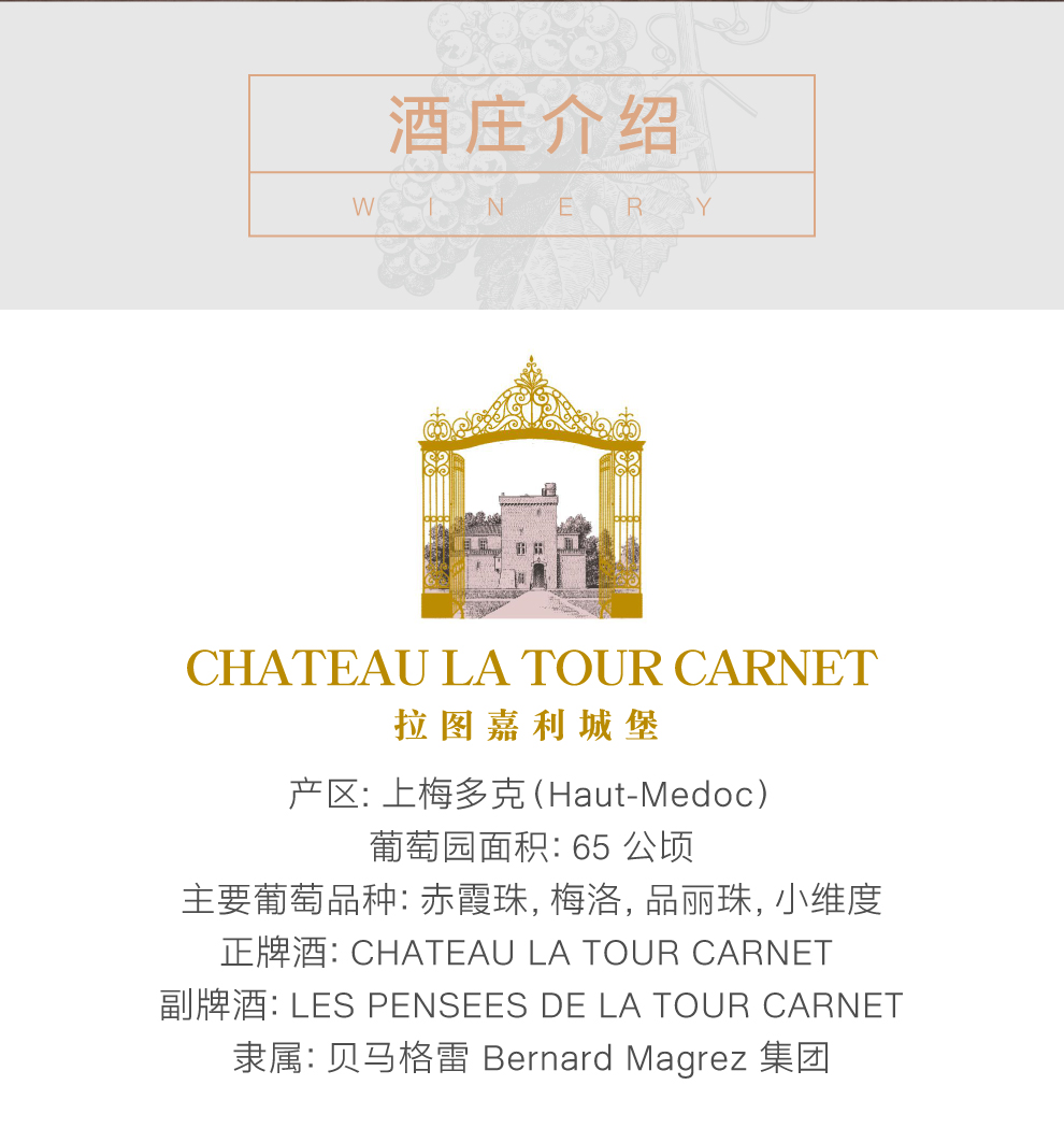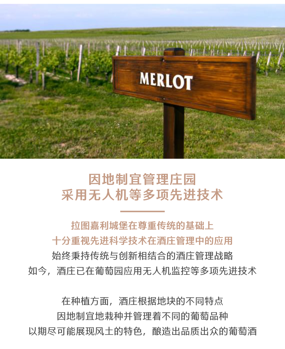 拉图嘉利于1999年被大名鼎鼎的酒商BernardMagrez贝尔纳.马格雷买下,更为严格的针对拉图嘉利土壤土质多样性的分块管理从此展开。尊重环境放弃除草和土壤改良,把重心放在提高作物潜能的种植酿酒哲学,保住了拉图嘉利名酒的声誉,更是将传统的方法和现代技术优化结合,精细灵活与差异性并存,毫无疑问地将拉图嘉利的盛名远播在外。10年后的2009年份拉图嘉利更是达到一个里程碑高峰。