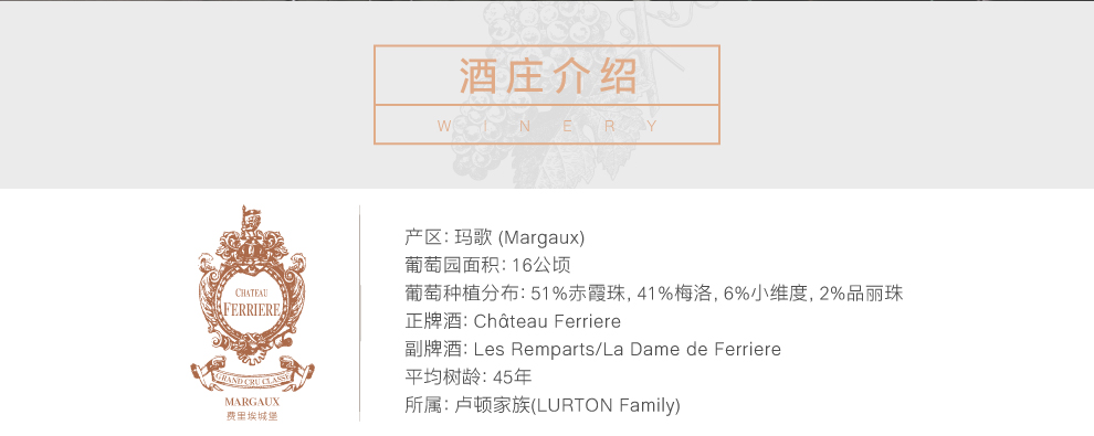 费里埃城堡的葡萄园位于大西洋(Atlantic Ocean)和吉伦特河(Gironde)阔的入海口之间,来自大西洋和吉伦特河的两大气流为葡萄树提供了温和的生长环境。园内土壤是典型的砾石土,并带有白垩泥灰岩,排水性良好。
