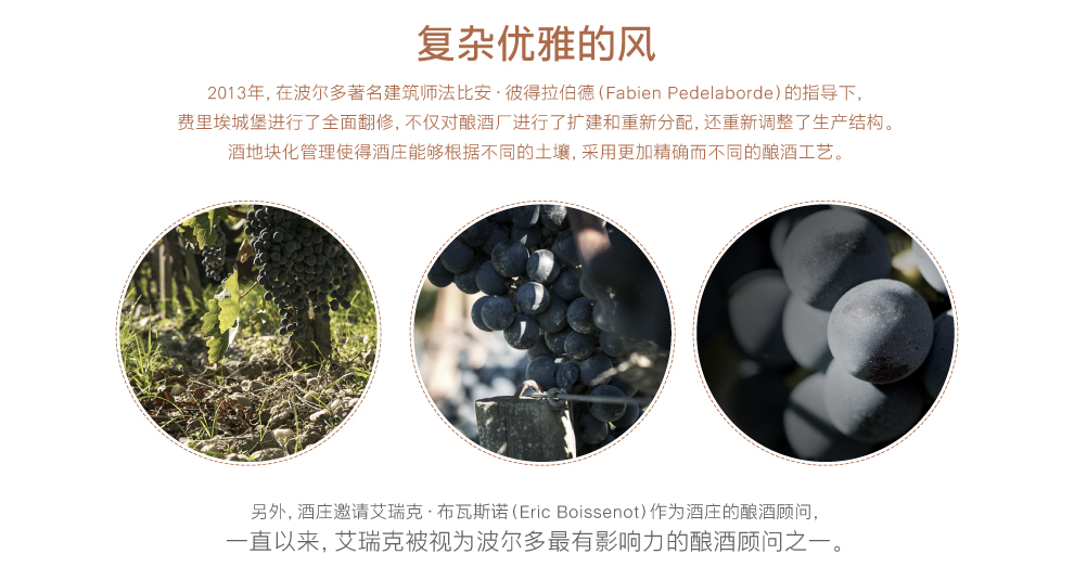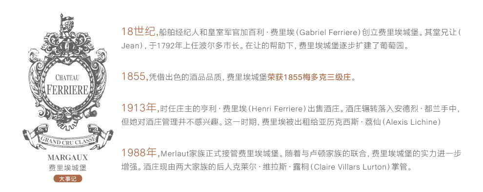 2015年,费里埃城堡通过法国国际生态认证中心评定,获得有机农业(Agri-culture Biologique)认证;从2016年开始,酒庄开始全面向生物动力法转变。