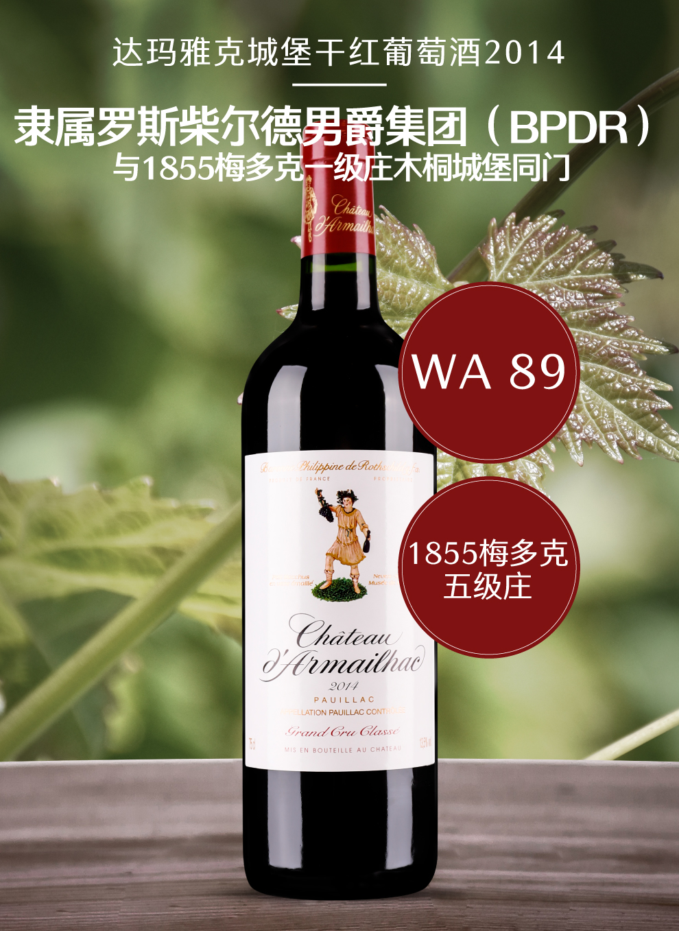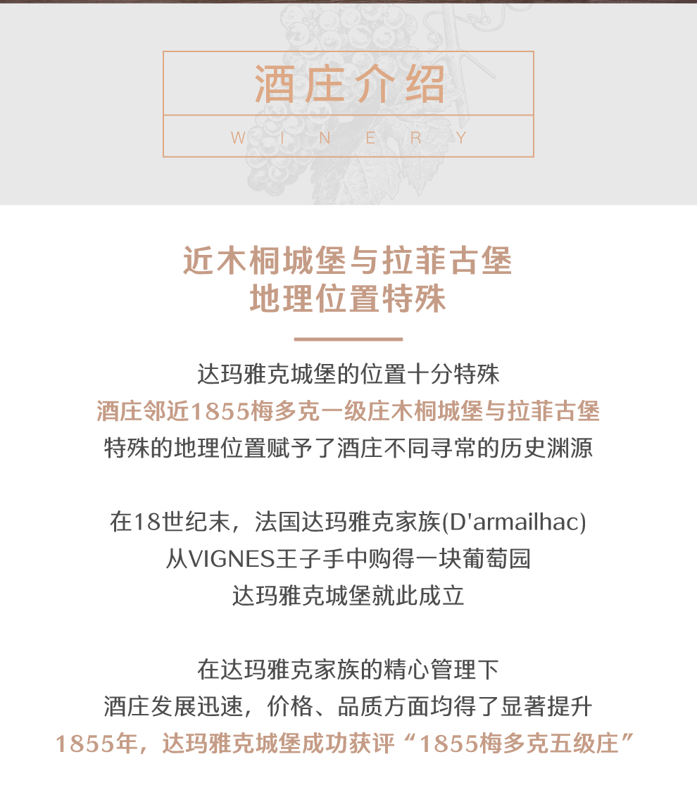 法国达玛雅克酒庄(CHATEAU D’ARMAILHAC)位于一级名庄木桐酒庄和拉菲酒庄隔壁,其相当特殊的地理位置赋予了其不简单的历史渊源。