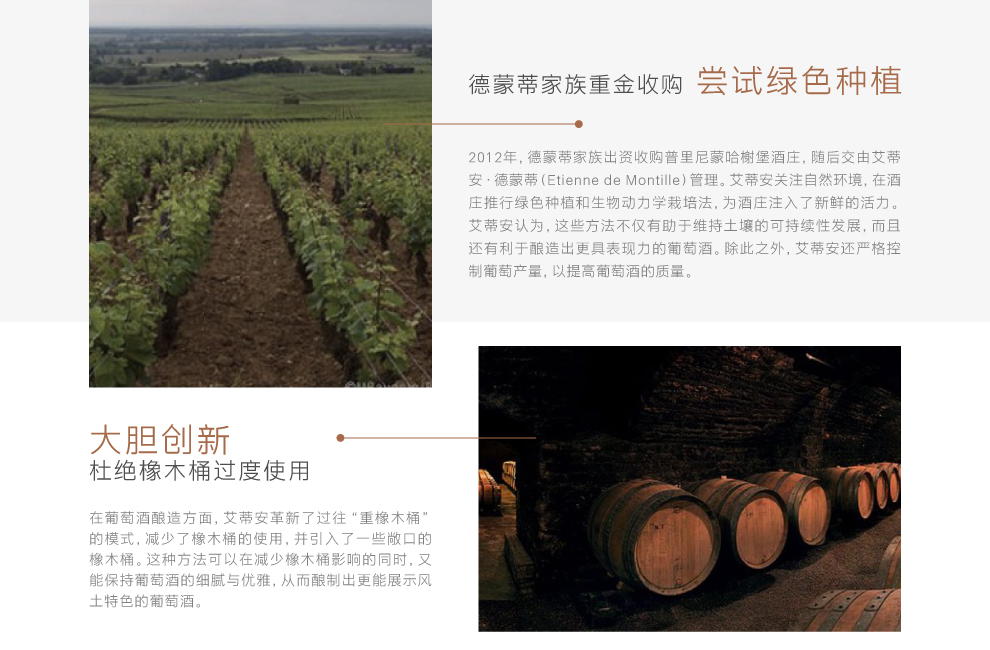 2012年,德蒙蒂家族出资收购普里尼蒙哈榭堡酒庄,随后交由艾蒂安·德蒙蒂(Etienne de Montille)管理。艾蒂安关注自然环境,在酒庄推行绿色种植和生物动力学栽培法,为酒庄注入了新鲜的活力。艾蒂安认为,这些方法不仅有助于维持土壤的可持续性发展,而且还有利于酿造出更具表现力的葡萄酒。除此之外,艾蒂安还严格控制葡萄产量,以提高葡萄酒的质量。