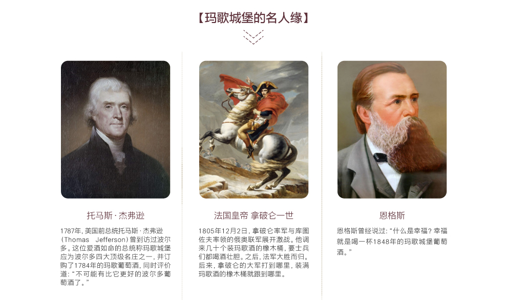 作为玛歌村中最灿烂的一颗明珠,古往今来,玛歌酒庄为无数名人挚爱,如 拿破仑、美国前总统托马斯·杰弗逊等等。