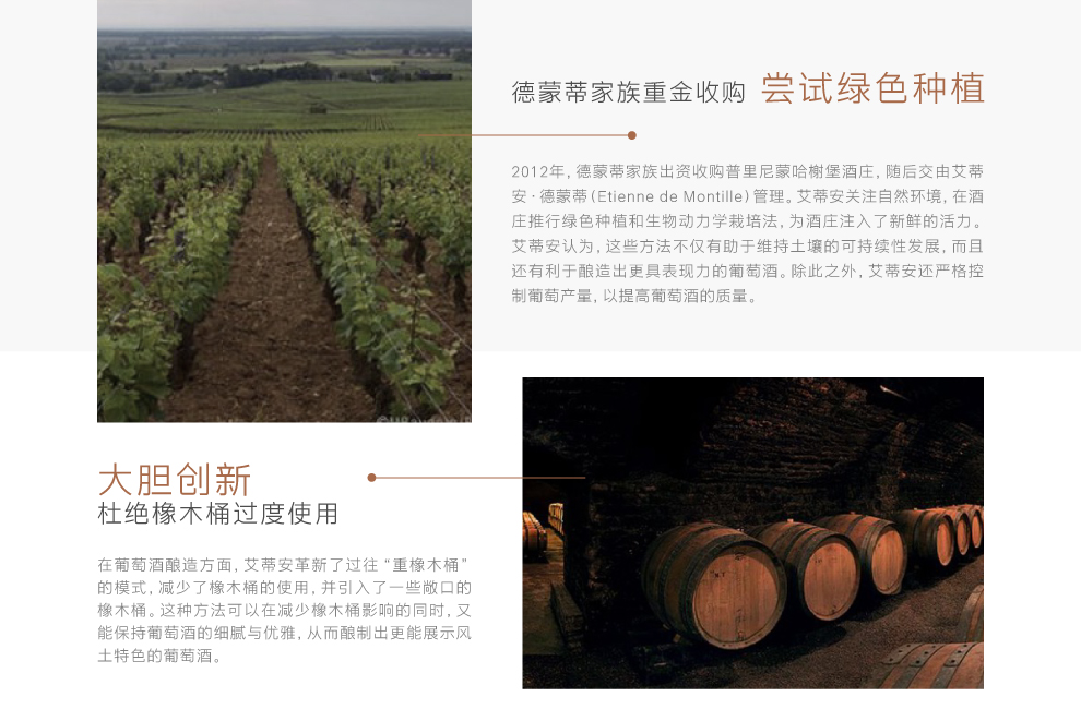 2012年,德蒙蒂家族出资收购普里尼蒙哈榭堡酒庄,随后交由艾蒂安·德蒙蒂(Etienne de Montille)管理。艾蒂安关注自然环境,在酒庄推行绿色种植和生物动力学栽培法,为酒庄注入了新鲜的活力。艾蒂安认为,这些方法不仅有助于维持土壤的可持续性发展,而且还有利于酿造出更具表现力的葡萄酒。除此之外,艾蒂安还严格控制葡萄产量,以提高葡萄酒的质量。