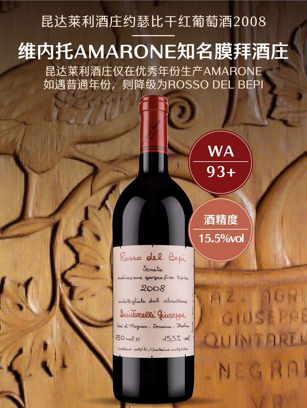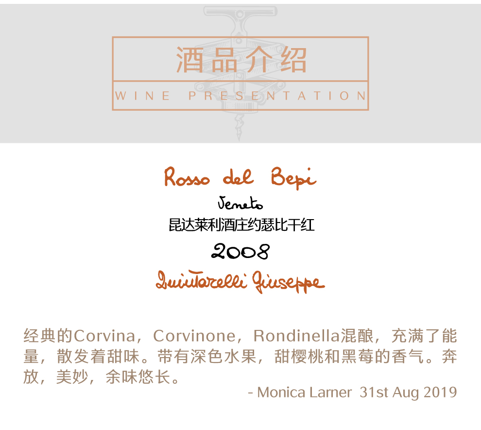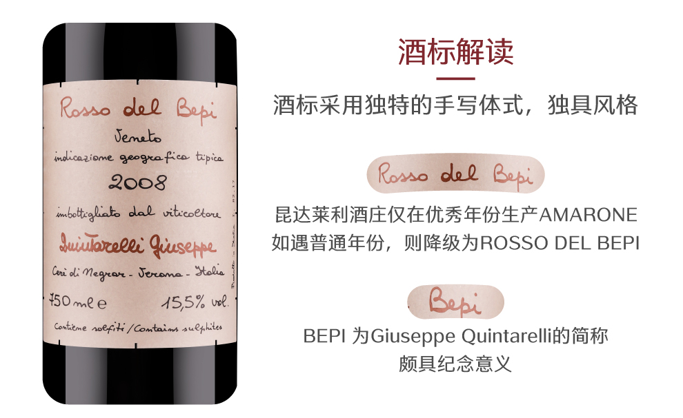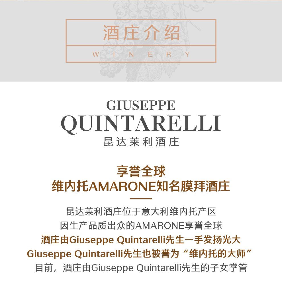 昆达莱利酒庄是威内托产区内最重要的生产商之一,且在Amarone酒上有绝对的威望并处于膜拜的位置。酒庄的创始人兼活招牌Giuseppe Quintarelli先生,人称Bepi, 更是为威内托的红酒树立了标准,这其中包含了Recioto, Valpolicella Superieure等各个级别的酒。Giuseppe老先生于2012年1月去世,享年84岁,她的妻子也于一年后离世。