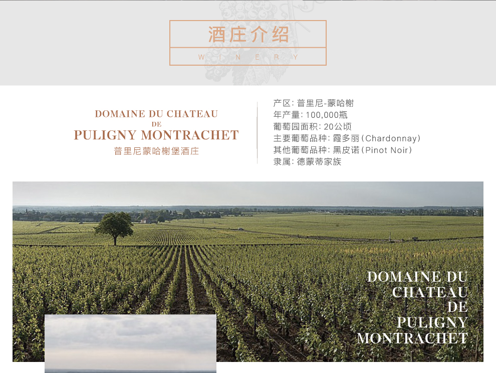 普里尼-蒙哈榭堡酒庄(Domaine du Chateau de Puligny-Montrachet)位于法国勃艮第伯恩丘(Cote de Beaune)内的普里尼-蒙哈榭(Puligny-Montrachet)产酒村,是当地名列前茅的知名酒庄之一,尤以干白葡萄酒闻名勃艮第。酒庄现拥有葡萄园20公顷,其中包含3个勃艮第特级园。