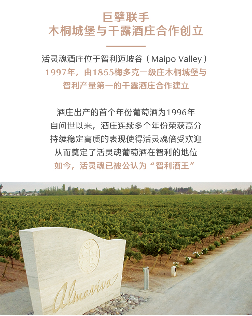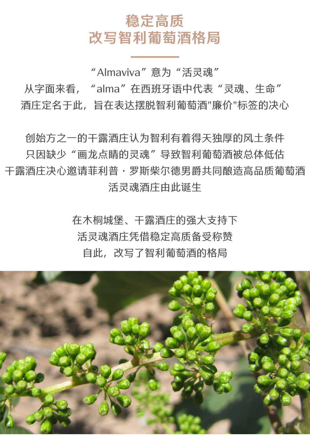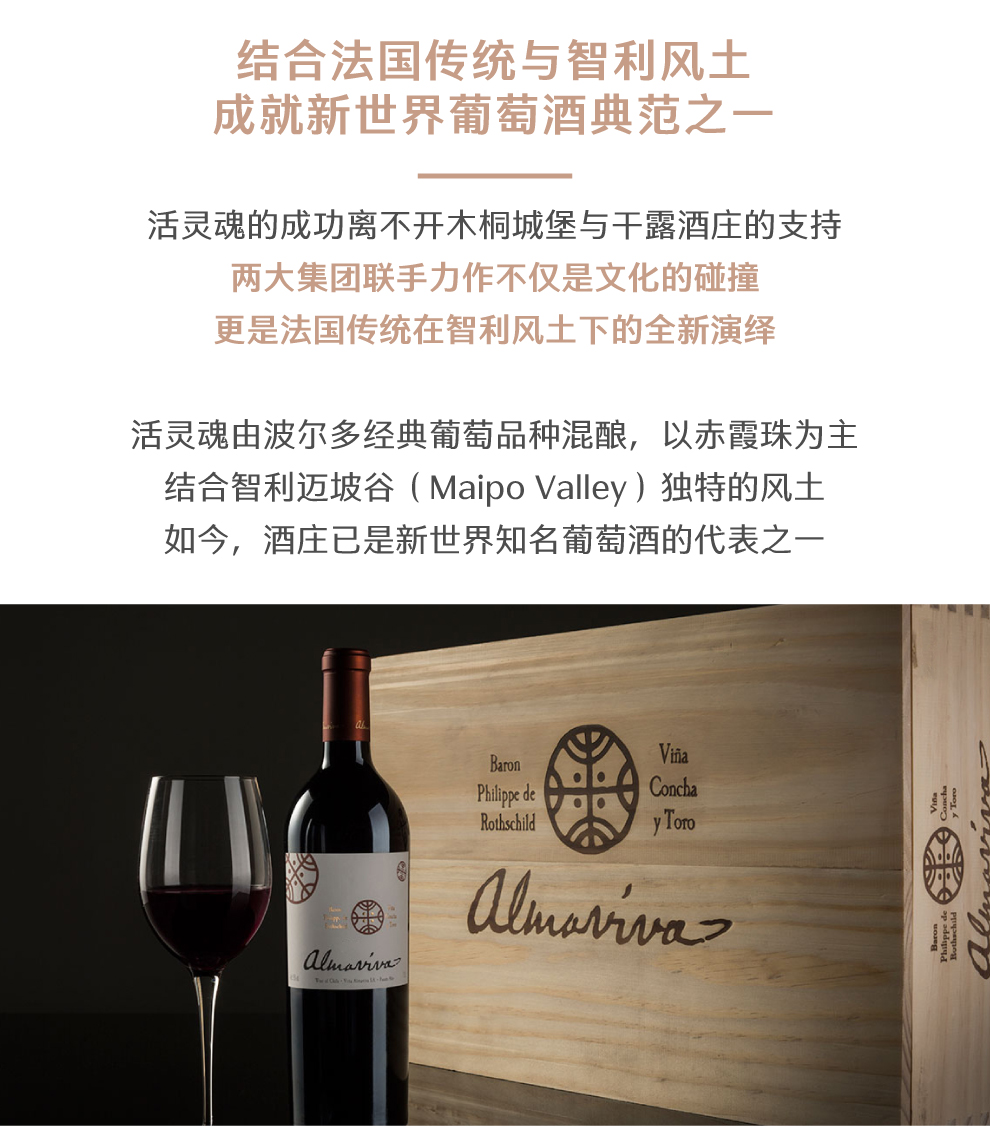 活灵魂酒诞生之后掀起了购买的热潮,《葡萄酒观察者》对2001年的活灵魂也打出了95分的高分。活灵魂被誉为“智利酒王”,由波尔多经典的葡萄品种混酿而成,以赤霞珠(Cabernet Sauvignon)为主。可以说,活灵魂是两种文化巧妙的相遇:智利提供土壤、气候及葡萄园,而法国贡献出酿酒技术和传统,最终酿造出异常雅致和复杂的葡萄酒。