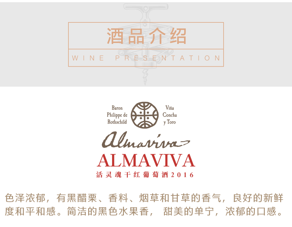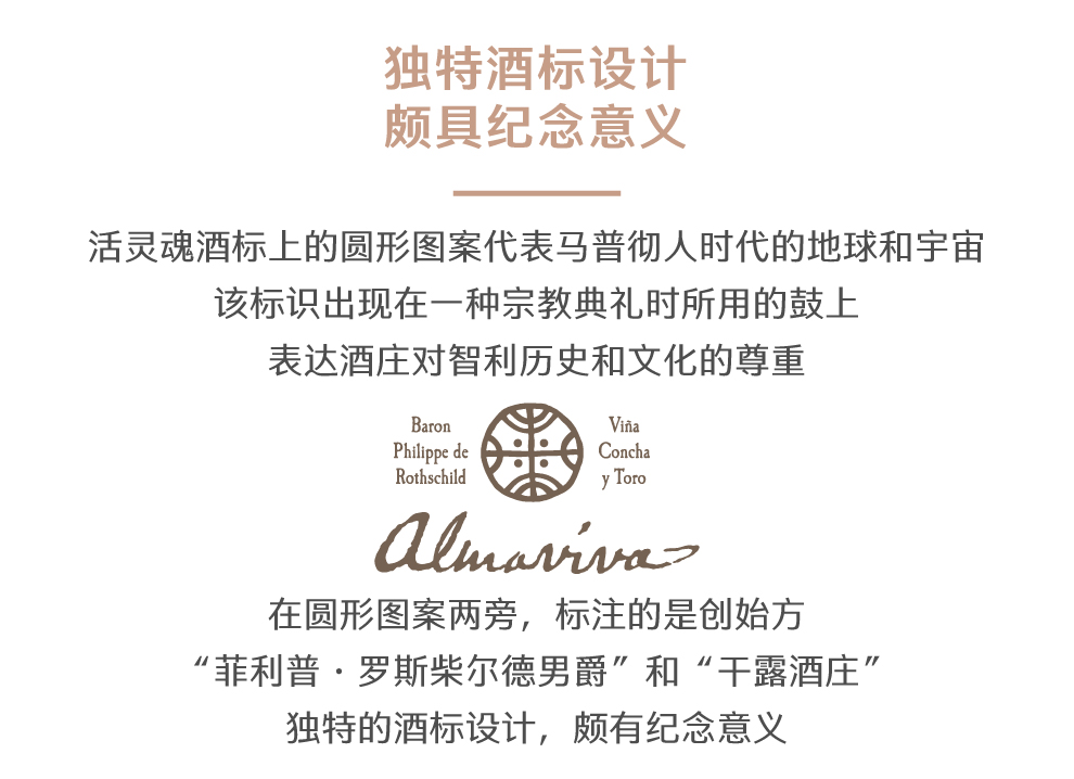 “Almaviva”的意为“活灵魂”。从字面来看,在西班牙文中“alma”是“灵魂、生命”的意思。 活灵魂酒庄为什么会取这个名字呢?据说,智利有着得天独厚的气候、水土,是酿造葡萄酒的天堂,但酿出的酒却无法摆脱“廉价”的标签,干露酒庄决心摆脱这一标签。他们清楚认识到智利葡萄酒的质量没有问题,缺少的就是那画龙点睛般的灵魂。于是,干露酒庄邀请了红葡萄酒界独一无二的“灵魂人物”菲利普罗斯柴尔德男爵 (Baron Philippe de Rothschild)来智利一起共同酿造举世闻名的好酒,于是双方很快便达成一致,创建了活灵魂酒庄。