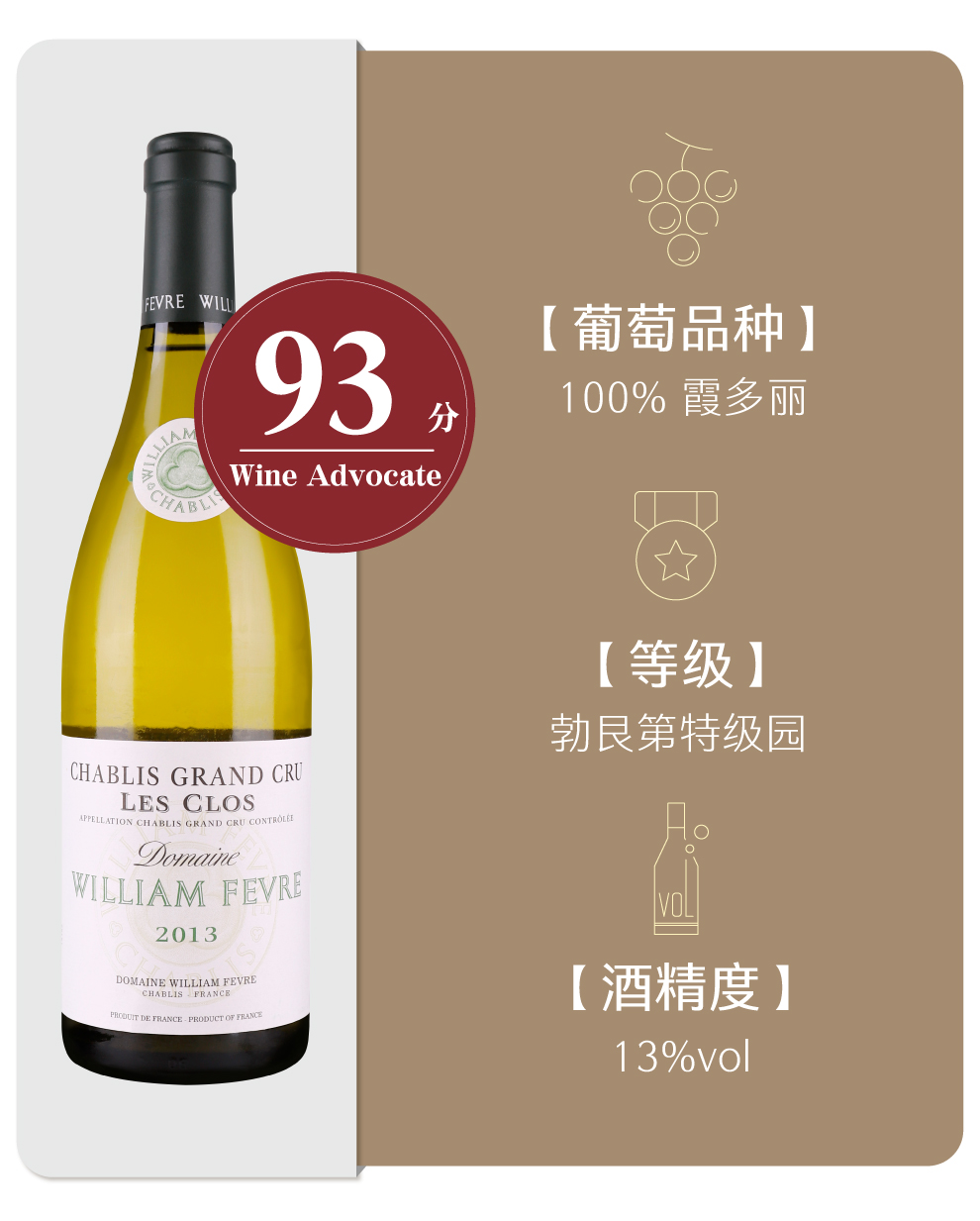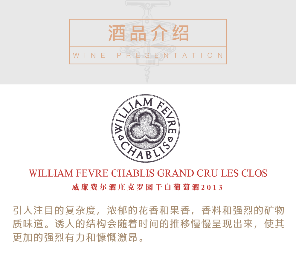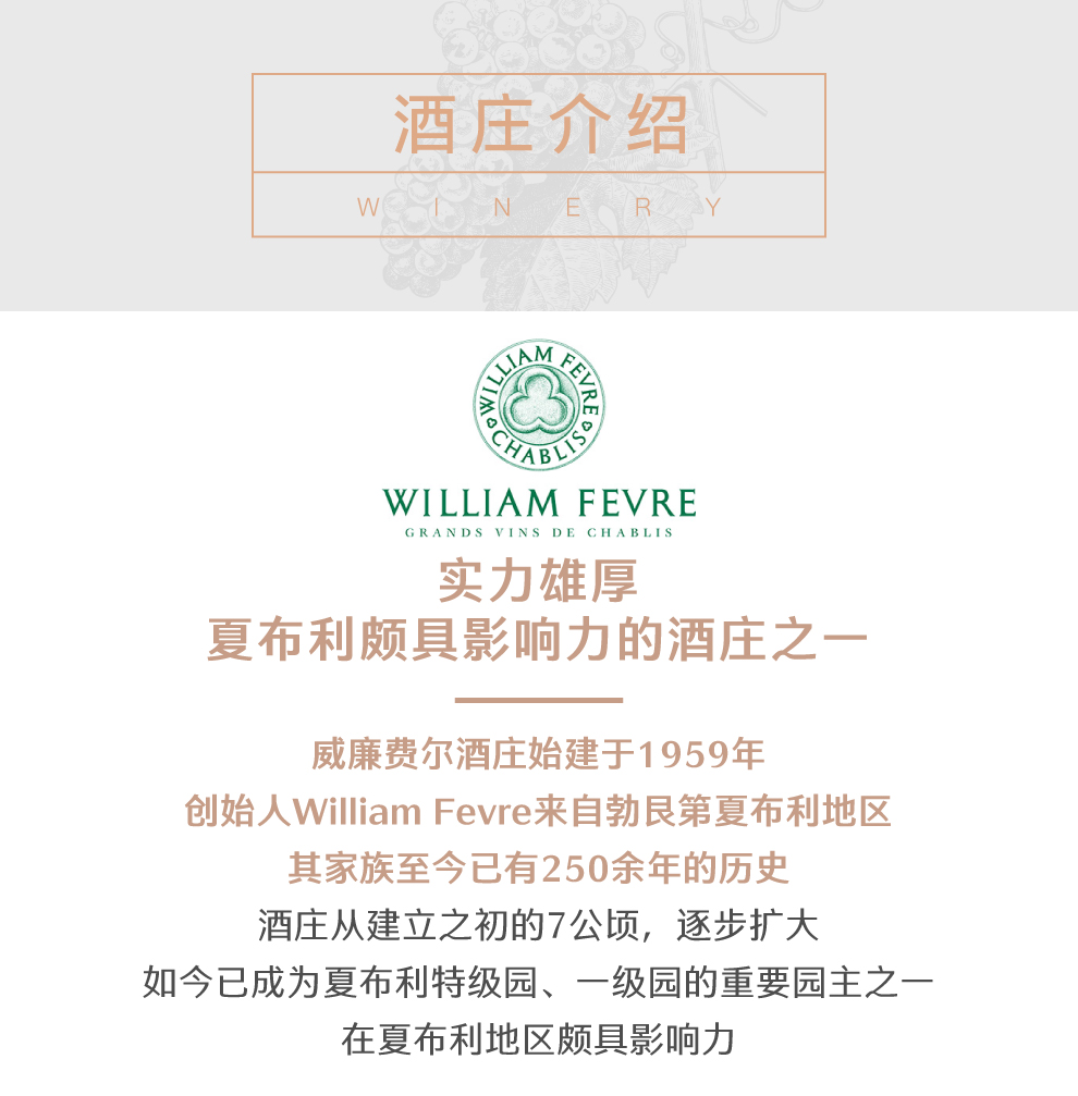 酒庄的创始人威廉·费尔(William Fevre)出生在一个在夏布利地区已经生活250年的家族。1959年,威廉·费尔创立了自己的葡萄酒公司,并推出首款葡萄酒。多年来,威廉一直潜心致力于酿制优质葡萄酒——把最真实的土壤特征反映在美酒中。1988年,来自香槟产区的亨利特(Henriot)家族,即宝尚父子酒庄的所有者,来此收购了该酒庄。新东家让宝尚父子的技术团队参与威廉•费尔酒庄葡萄酒的酿制,进一步地提高了其葡萄酒的品质。威廉·费尔酒庄目前共占地47公顷,其中夏布利特级葡萄园(Grand Cru)15.2公顷,一级葡萄园(Premier Cru)12公顷。用来栽培霞多丽(Chardonnay)的土壤为黏土和白垩土。采摘后的葡萄酒经过筛选后会进行酿制。酿制得来的干白葡萄酒之后大部分会在小型不锈钢桶中熟成8至10个月,有10%会在法国橡木桶中熟成。