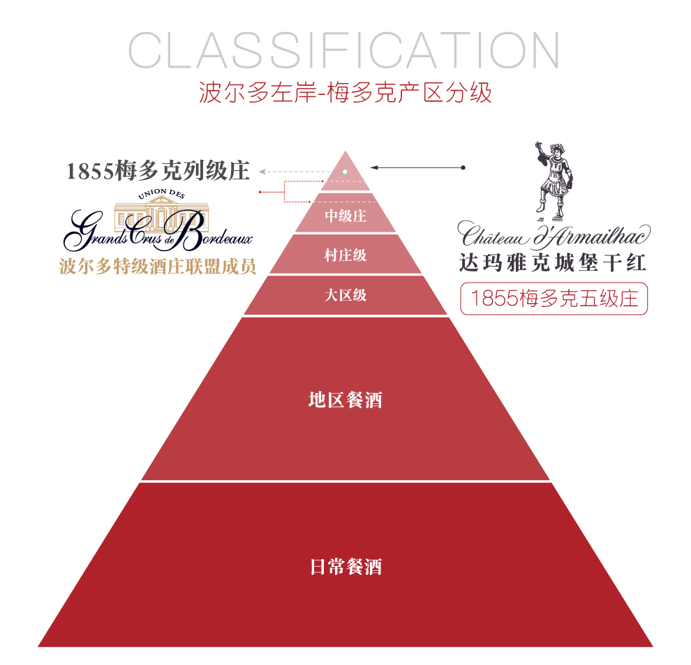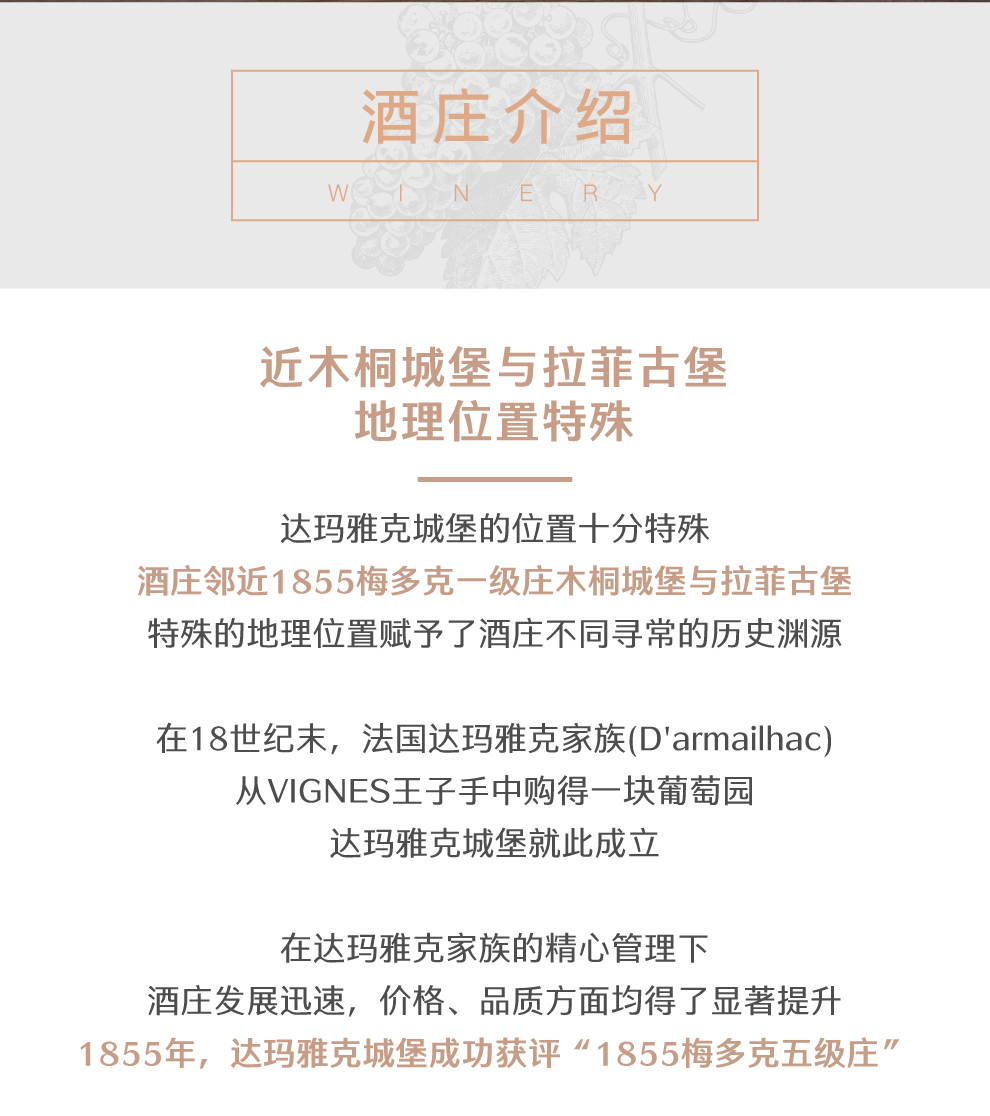 法国达玛雅克酒庄(CHATEAU D’ARMAILHAC)位于一级名庄木桐酒庄和拉菲酒庄隔壁,其相当特殊的地理位置赋予了其不简单的历史渊源。