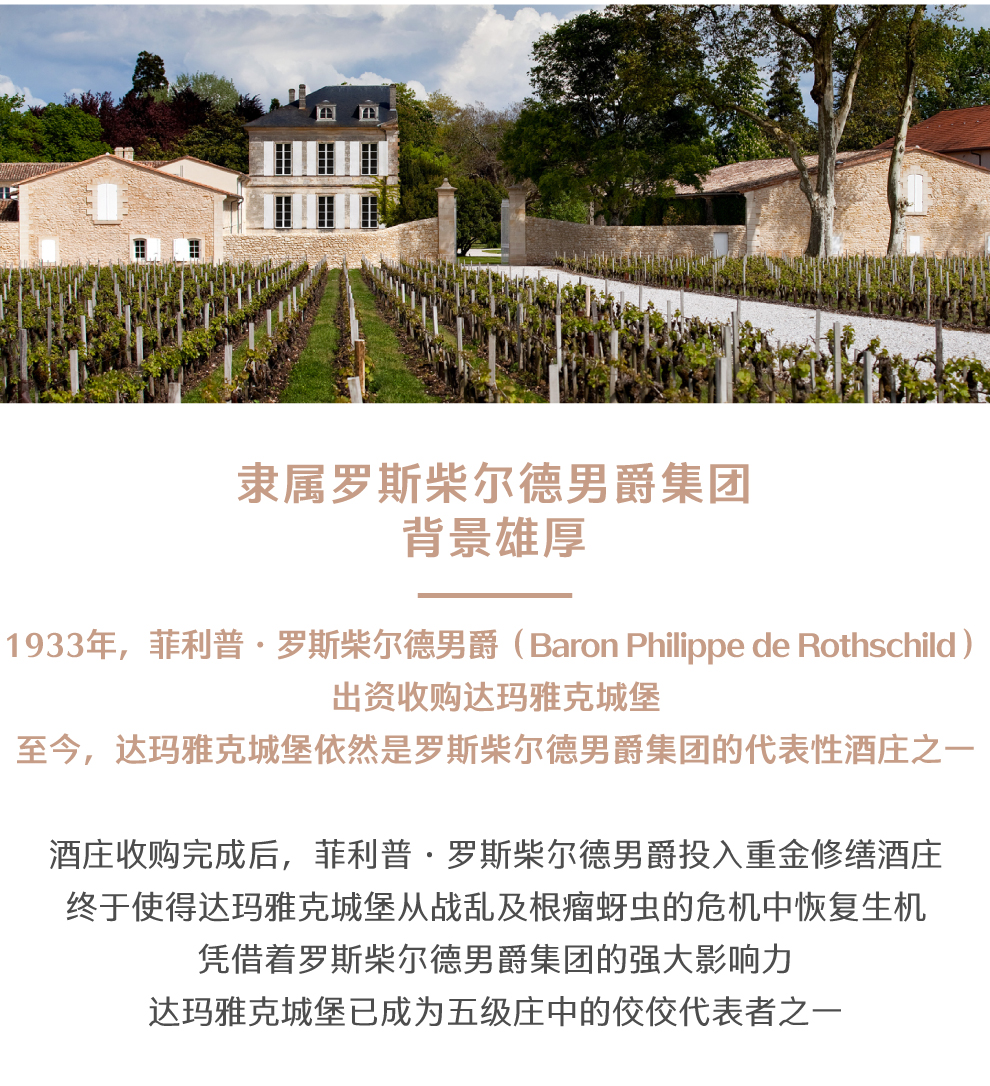 1933年,达玛雅克庄园在极其无奈的状况下被出售给罗斯柴尔德集团(Rothschild ),并成为木桐庄园(Chateau Mouton Rothschild)的一部分,时至今日,达玛雅克庄园依旧由罗斯柴尔德家族掌管着。