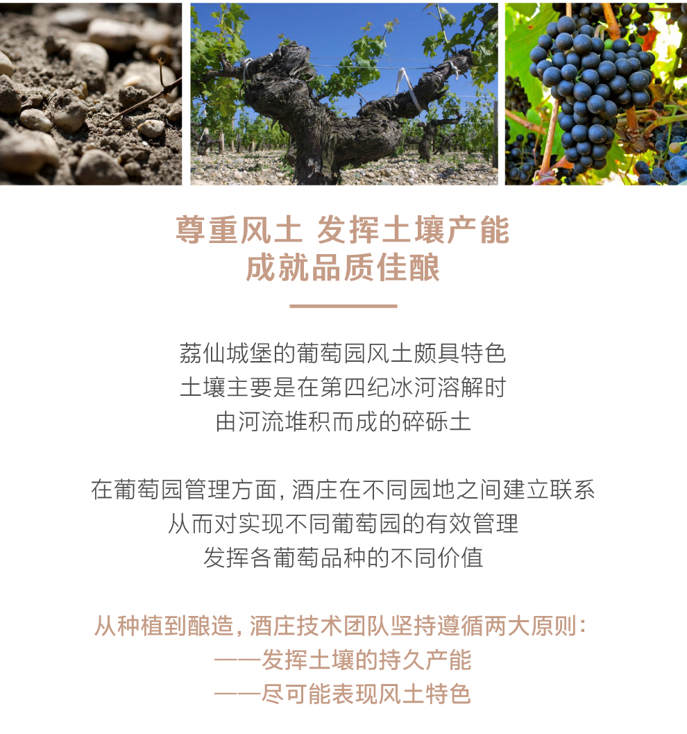 酒庄管理者十分注重风土特性的表达,他们将特定的品种栽种到最适合的土壤上,以充分释放每个葡萄园地块的潜力。同时,酒庄采用环境友好型种植方式,通过提高树冠、剪枝去叶等方式提高葡萄成熟度,并在夏天时减少葡萄串数量以调整控制产量。