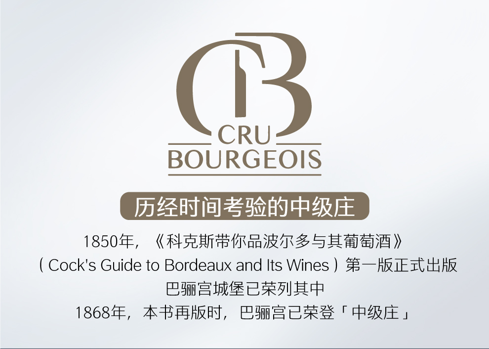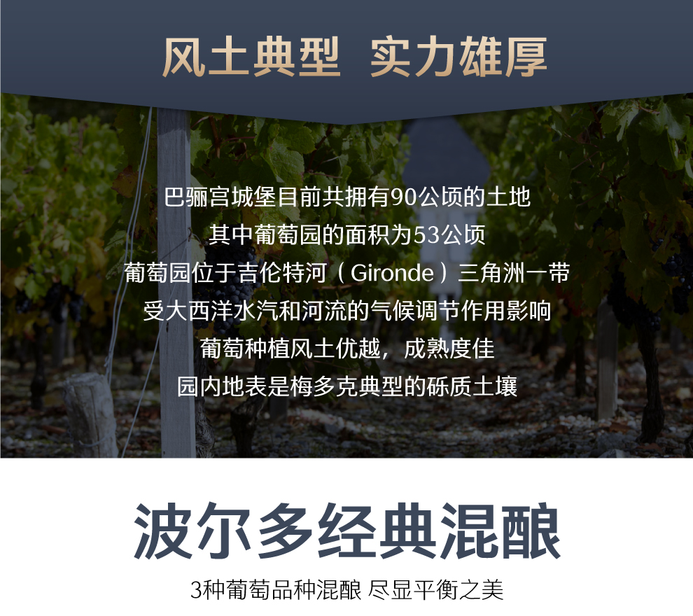 巴骊宫城堡目前共拥有90公顷的土地,其中葡萄园的面积为53公顷。葡萄园位于吉伦特河(Gironde)三角洲一带,受大西洋水汽和河流的气候调节作用影响,葡萄种植风土优越,成熟度也较佳。园内地表覆盖了梅多克(Medoc)经典的砾质土壤,主要种植45%赤霞珠(Cabernet Sauvignon)、50%梅洛(Merlot)和5%味而多(Petit Verdot)。成熟的酿酒葡萄经过轻柔破碎压榨之后,部分经过不锈钢桶发酵,而后进行12至18个月的法国橡木桶熟成,成酒风格比较柔软,单宁如丝般顺滑,别有一番优雅质感。