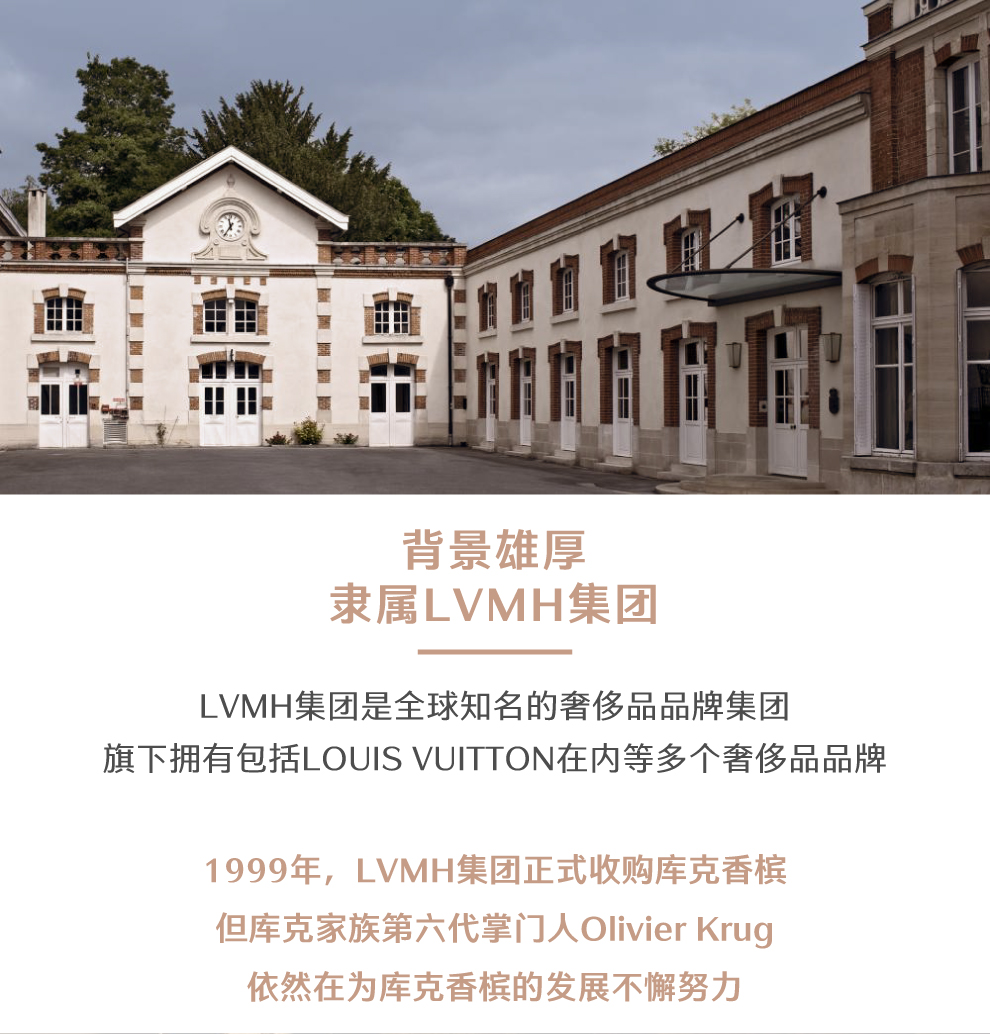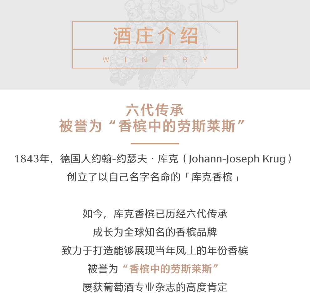 库克香槟(Champagne Krug)由德国人约翰-约瑟夫•库克(Johann-Joseph Krug)创建于1843年,现今已传承了6代人。库克酒庄的创建人约翰是一位有抱负的酿酒者,致力于酿造出与众不同的香槟。他原本任职于另一家知名香槟酒庄雅克森(Jacquesson),为追求一种具有独创风格的香槟而放弃了那里的优厚待遇,自辟江山,创立了自己的酒庄——库克香槟。虽然当时所有的人都认为这是一条布满荆棘的路,但约瑟夫•库克却始终坚持自己的选择。终于,他开启了自己生产的香槟庆祝胜利。此后,历经5代传承,库克酒庄的声誉日渐远播至全球各地,成为世界上最具个性的顶级香槟酒庄。