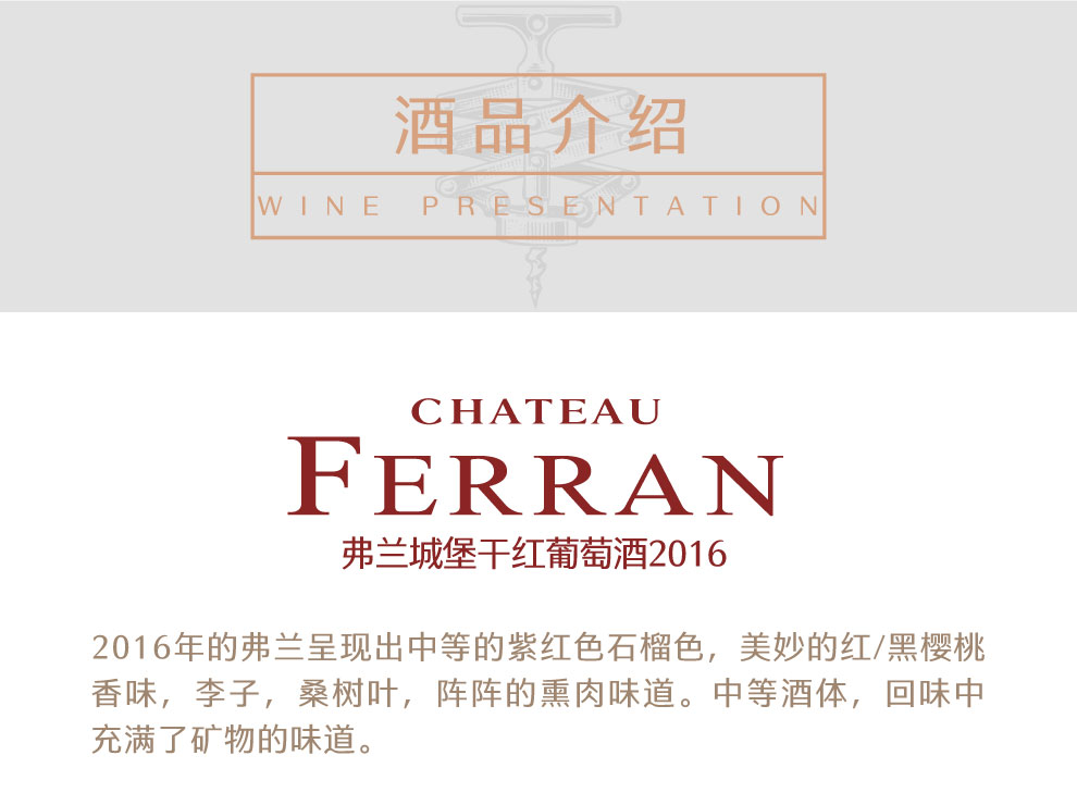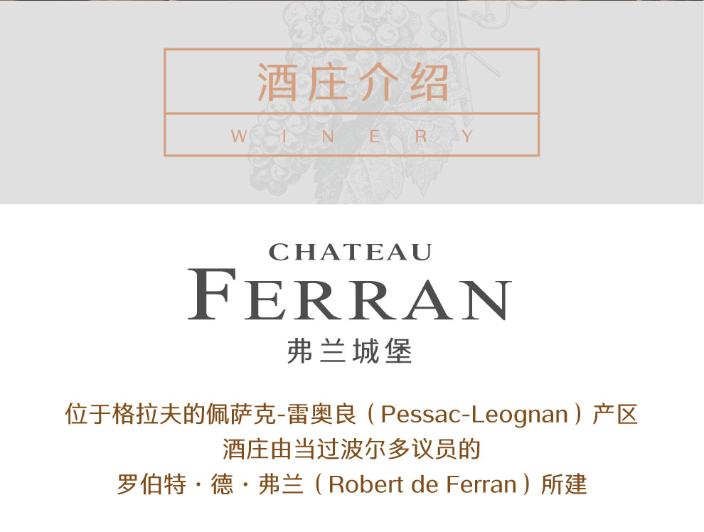 弗兰城堡位于坐落在两海之间(Entre-deux-Mers)产区的西南方向。现任庄主是阿朗·菲兰(Alain Ferran)。