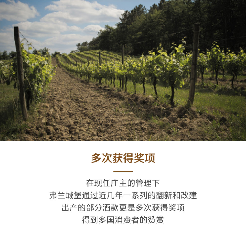 弗兰城堡的葡萄园始建于1976年,面积为35公顷。在葡萄园的四周环绕着树林,拥有独特的风土条件。园中的土壤成分主要是粘土和石灰岩,有利于种植多个葡萄品种。酒庄根据不同的土壤特性把葡萄园分成小区块分别管理,其中在葡萄园20%的区域种有长相思(Sauvignon Blanc)、赛美蓉(Semilllion)和密斯卡岱(Muscadelle)等白葡萄品种,而在剩余的区域则种有赤霞珠(Cabernet Sauvignon)、梅洛(Merlot)和品丽珠(Cabernet Franc)等红葡萄品种。酒庄采用有机种植模式和可持续发展模式严格管理葡萄园,最大限度地维持葡萄园的生态平衡,以获得天然风味物质浓郁的优质葡萄。