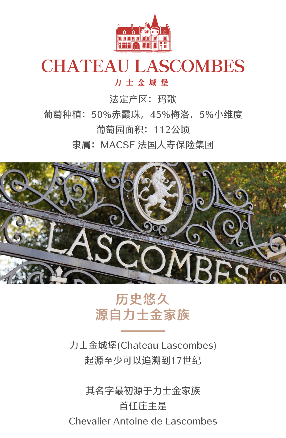 Lascombes 为波尔多1855年梅多克二级酒庄,也是梅多克(Medoc)区面积最大的酒庄之一,所拥有的地块十分的分散,在玛歌(Margaux)产区拥有大约40 个以上的酒园。 Lascombes 由赤霞珠(Cabernet Sauvignon)梅洛( Merlot) 小维尔多(Petit Verdot) 混合酿成,并在60% 新橡木桶中醇化18个月。酒庄风格以出产典雅均衡且充满黑醋栗果味的酒款闻名,陈年后更加深其复杂度。2001 年延续2000 年的成功,在 Yves Vatelot (Ch. Reignac) 及Dr. Alain Raynaud (Ch. Quinault l’Enclos) 的指导下持续酿造出绝佳的质量。酒中含有圆润的花香、蓝莓、黑莓以及黑茶子香气,甜美的单宁以及令人印象深刻的集中度。尾韵十分悠长。发酵前处理在8℃下持续一个星期;28℃下酒精发酵,30℃下浸皮;在橡木桶中进行苹果乳酸发酵,温度控制在21℃;正牌酒和副牌酒都要带酒槽熟化4个月 ;每三个月通过压缩空气进行一次滗析;使用传统的蛋清澄清法。在橡木桶中陈酿18-20个月。