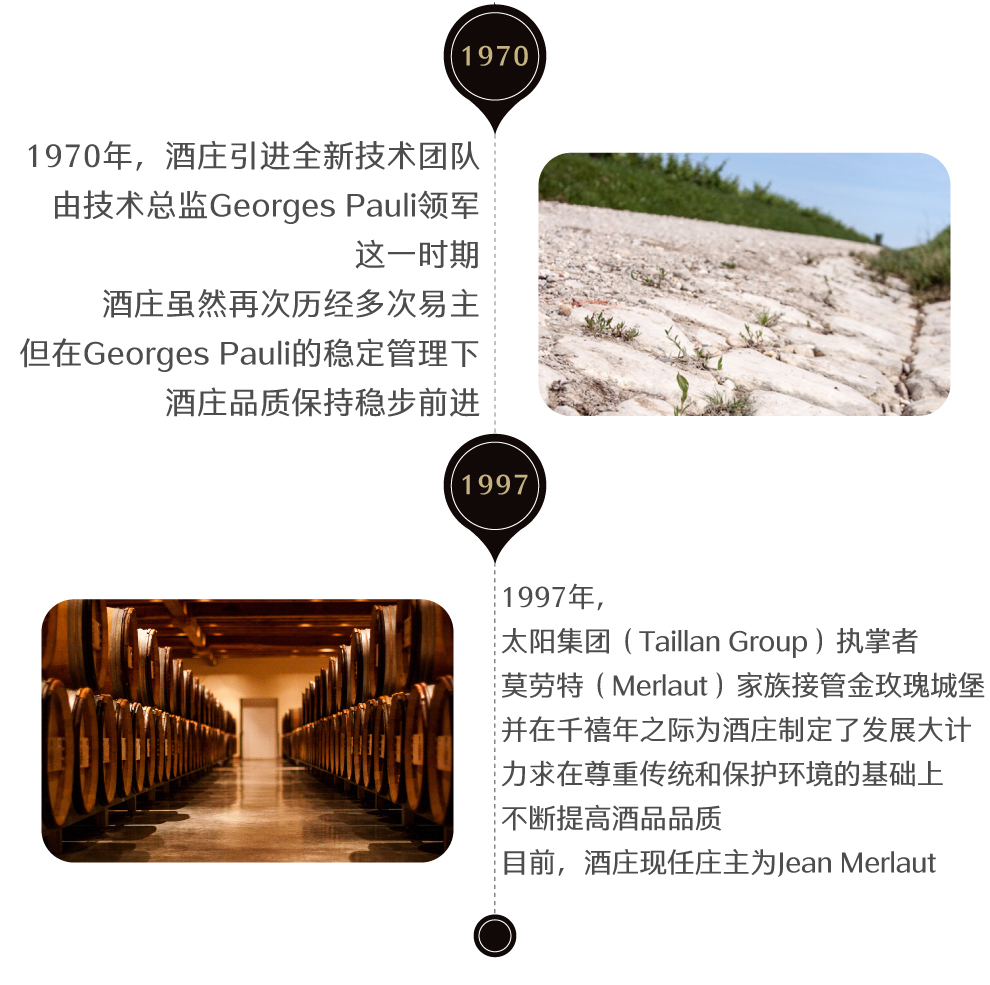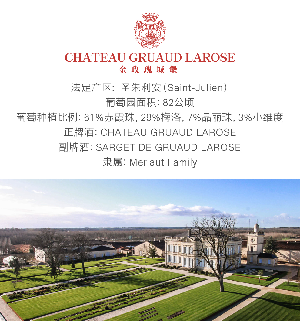 1855年梅多克分级二级庄Chateau Gruaud Larose位于波尔多左岸Saint Julien, 城堡于1725年建立, 而1791年时才正式有了Gruaud Larose这个名字, 几百年来因财产继承以及买卖等过程, 城堡所有权分分合合, 1917年Cordier家族先买下当时一分为二的Chateau Gruaud Larose其中一半的所有权-Gruaud Larose Sarget, 并于1935买下另一半Gruaud Larose Bethmann, 直到此时Chateau Gruaud Larose终于结束百多年来的分裂, 在Cordier家族的致力经营之下, 也出现了极为精采的1961年份, 以及1962, 1966, 1970年等佳酿。1970年开始酒庄引进新的技术团队, 由技术总监Georges Pauli领军, 1983年苏伊士Suez集团入主, 1993年又转手到艾卡特·艾斯森Alcatel Alsthom集团旗下, 引进计算机管理以及许多新科技, 并扩大厂房及更新酒窖设备, 使Chateau Gruaud Larose更为现代化, 1997年Merlaut家族入主, 现今庄主为Jean Merlaut, 1970年代开始虽然酒庄数度易主, 但仍由Georges Pauli执掌的技术团队负责酿酒。