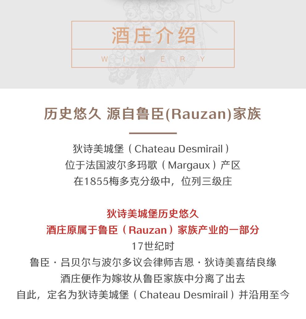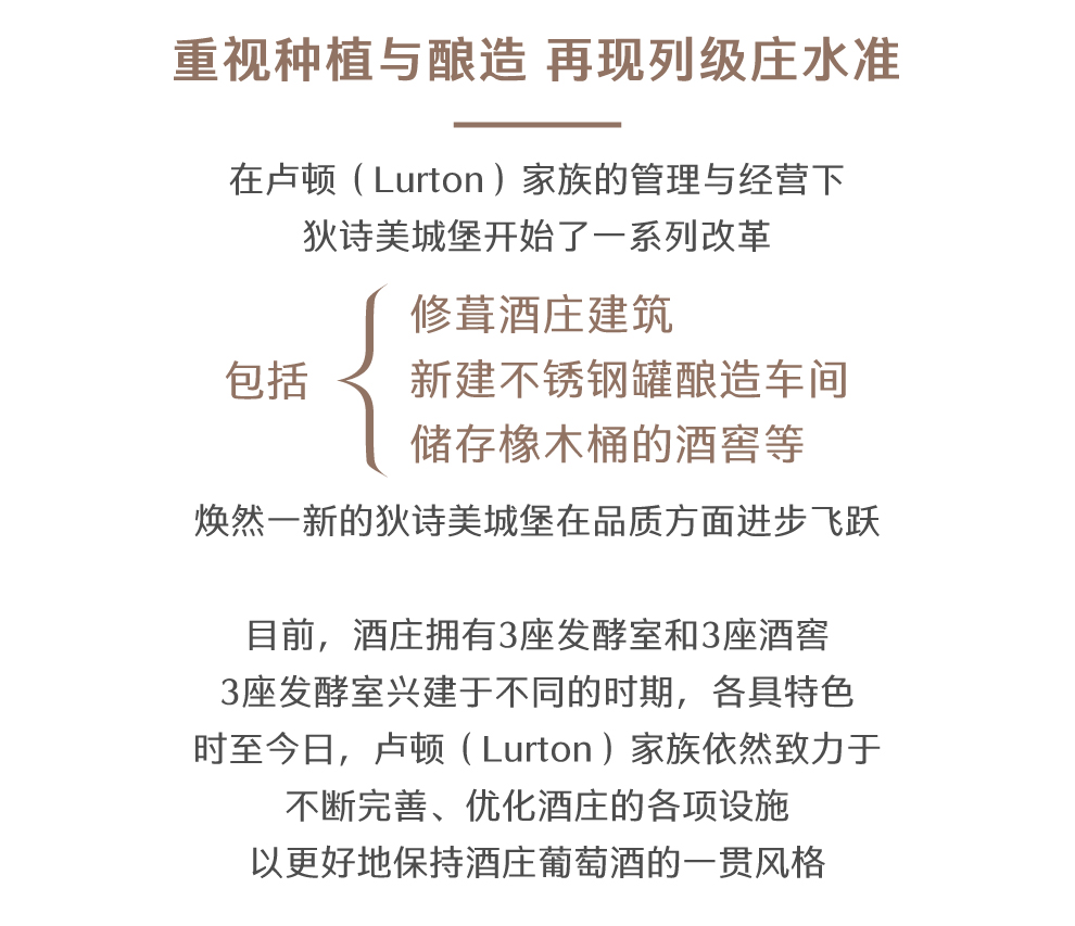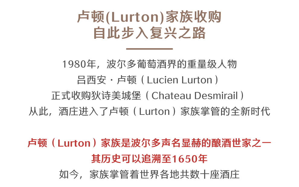 位于玛歌产区的宝马酒庄(CHATEAU PALMER)曾经营该酒庄数年,并于1980年将其转让给了在波尔多德高望重的LURTON家族的掌舵人,Lucien LURTON。1992年,LURTON家族的十个孩子分别继承了家族的产业,其中,Denis作为长子,继承了狄士美城堡,并努力对酒庄进行现代化改造,维护其良好声誉。