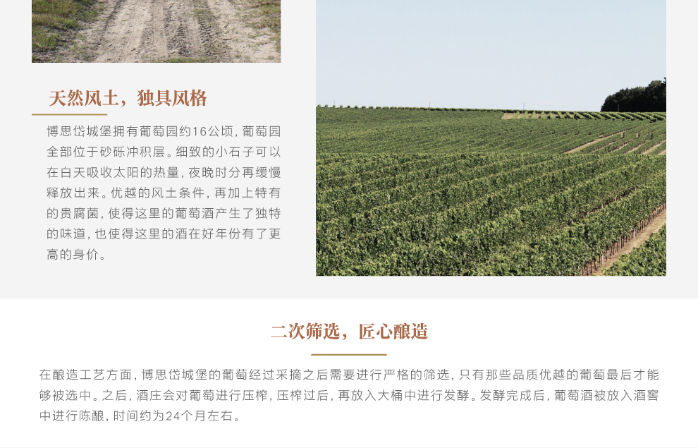 在酿造工艺方面,博思岱酒庄的葡萄经过采摘之后需要进行严格的筛选,只有那些品质极为优秀的葡萄最后才能够被选中。之后,对葡萄进行压榨,压榨过后,放入大桶中进行发酵。发酵完成后,葡萄酒被放入酒窖中进行陈酿,时间约为24个月左右。